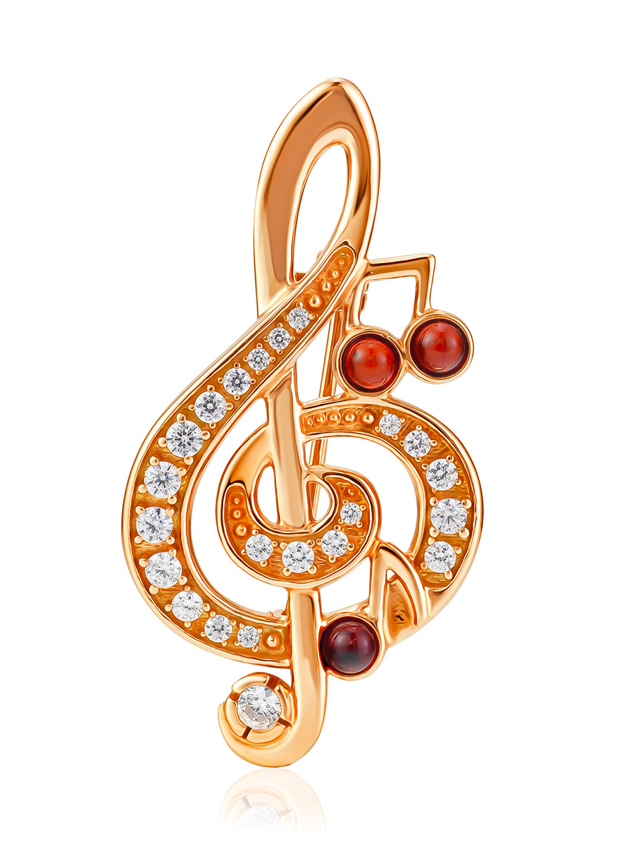 Изящная брошь с янтарём и фианитами «Скрипичный ключ»