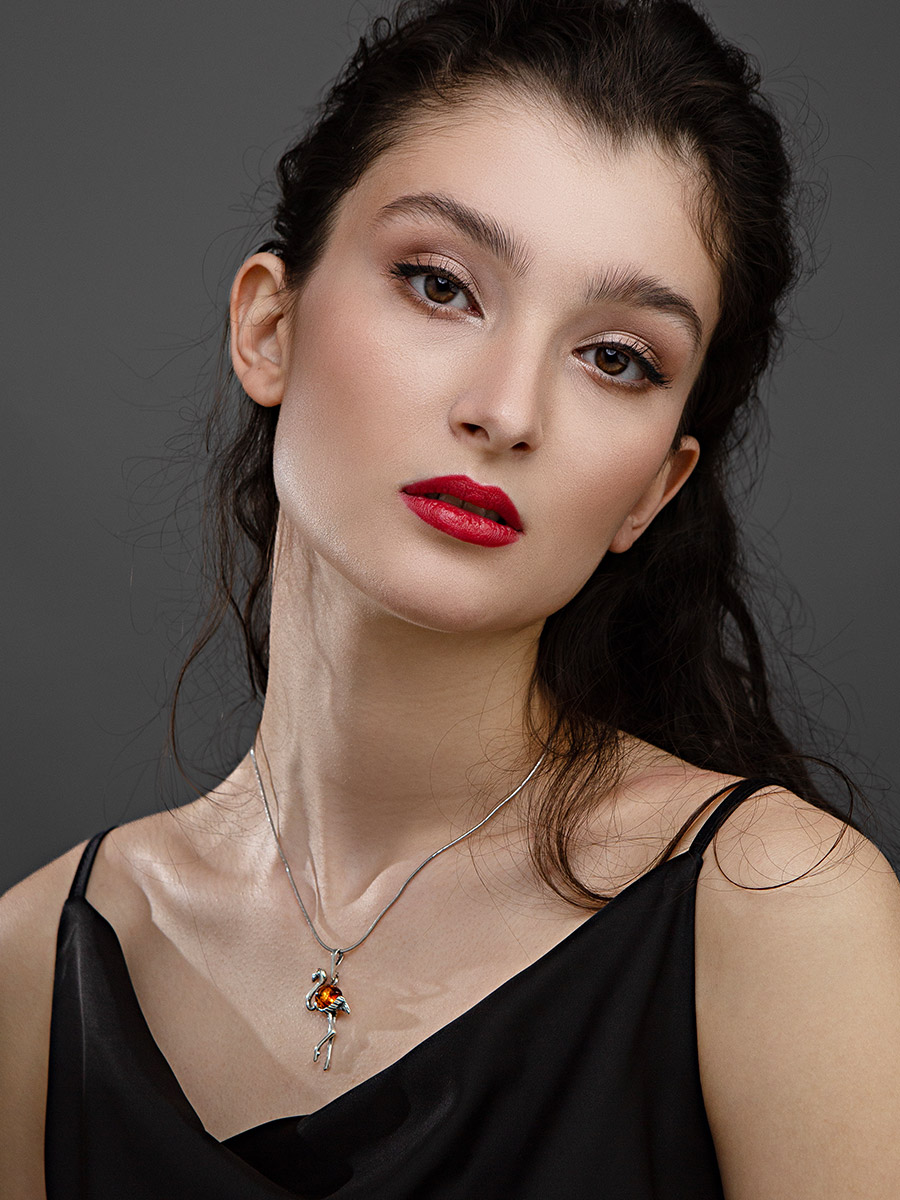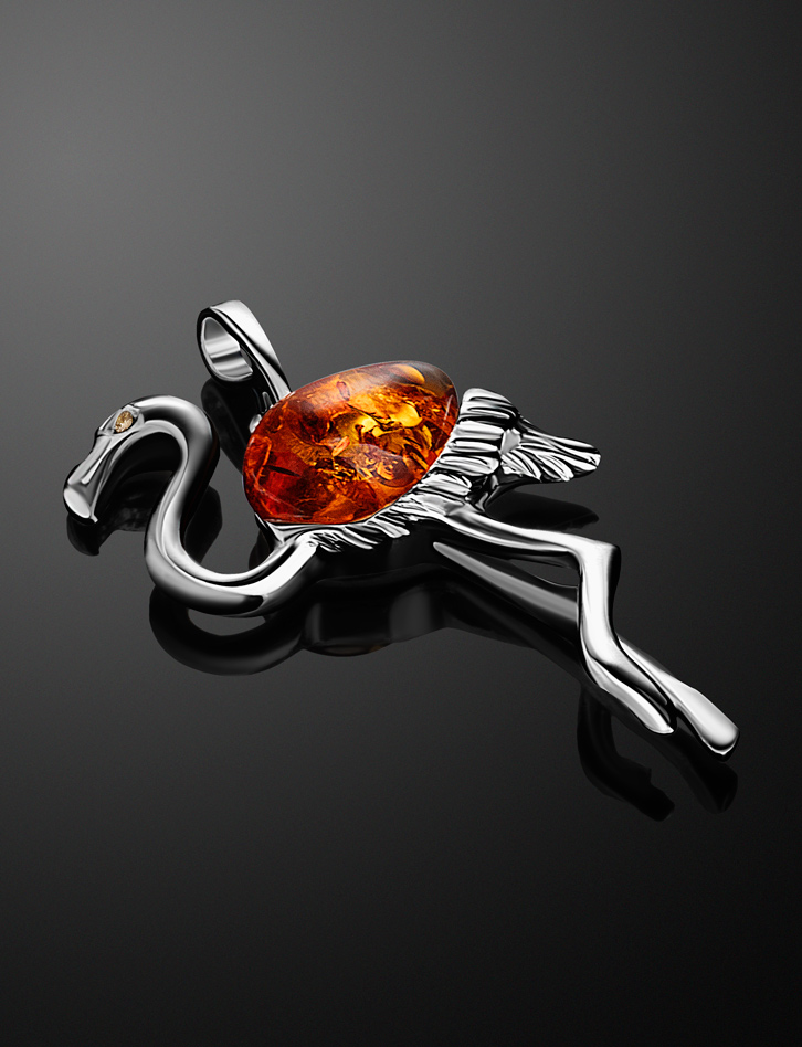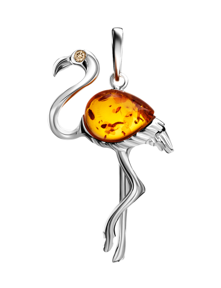Изящная подвеска «Фламинго» с натуральным коньячным янтарём