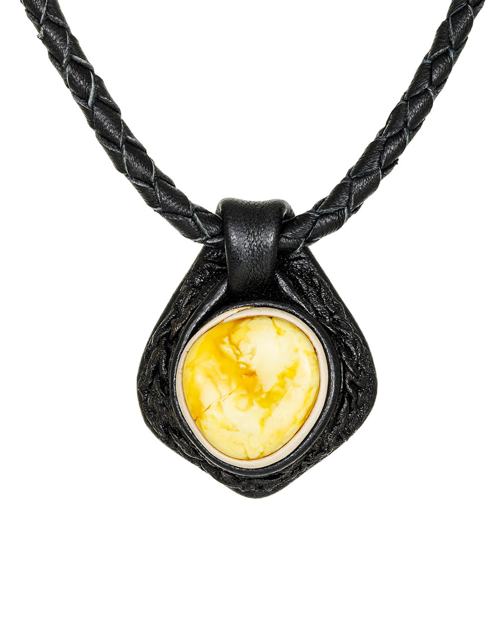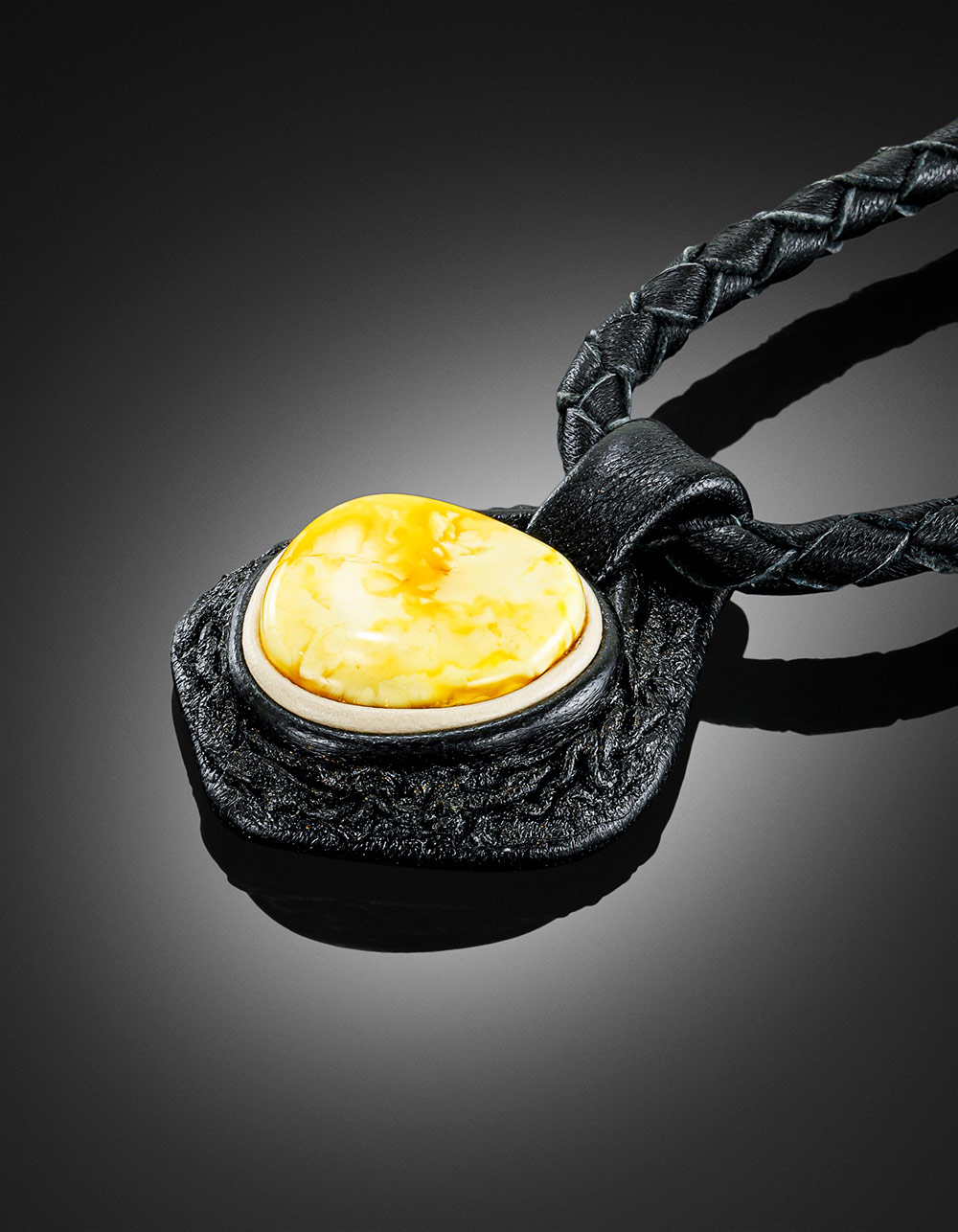 Изящная подвеска из черной кожи с вставкой насыщенного медового янтаря «Амазонка»