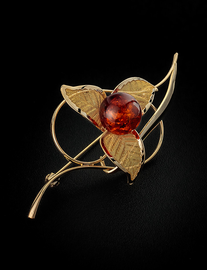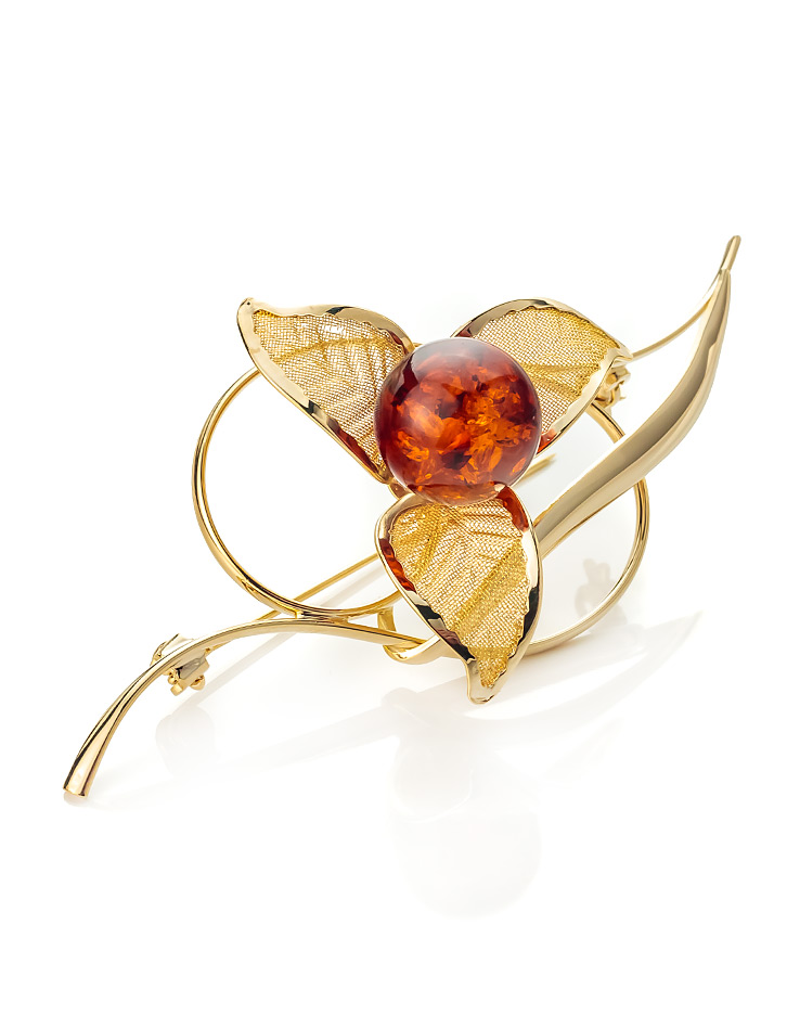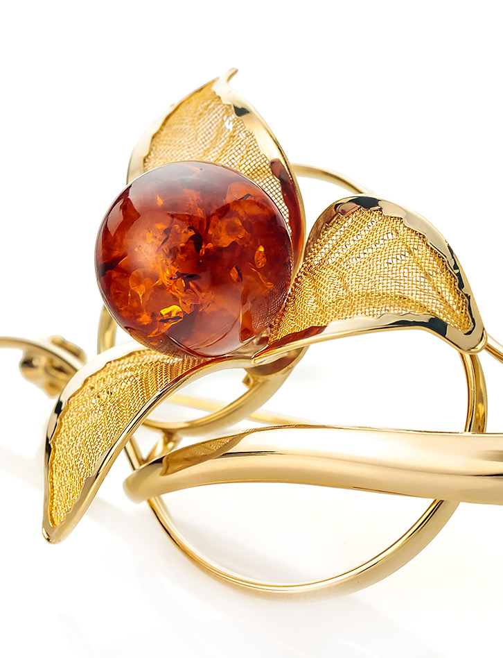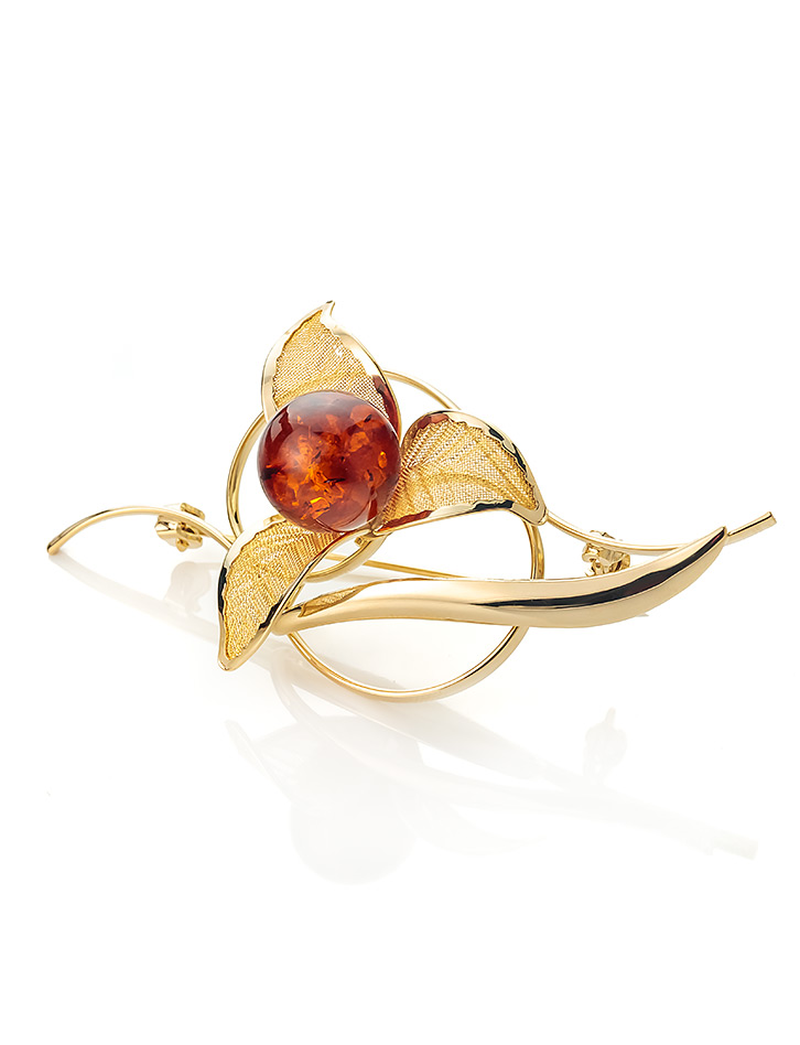 Изящная позолоченная брошь с натуральным коньячным янтарём Beoluna