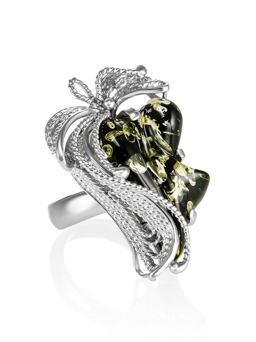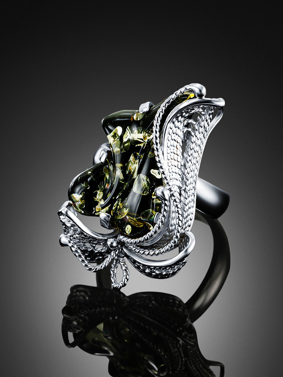 Изящное кольцо с натуральным балтийским янтарём зелёного цвета «Филигрань»