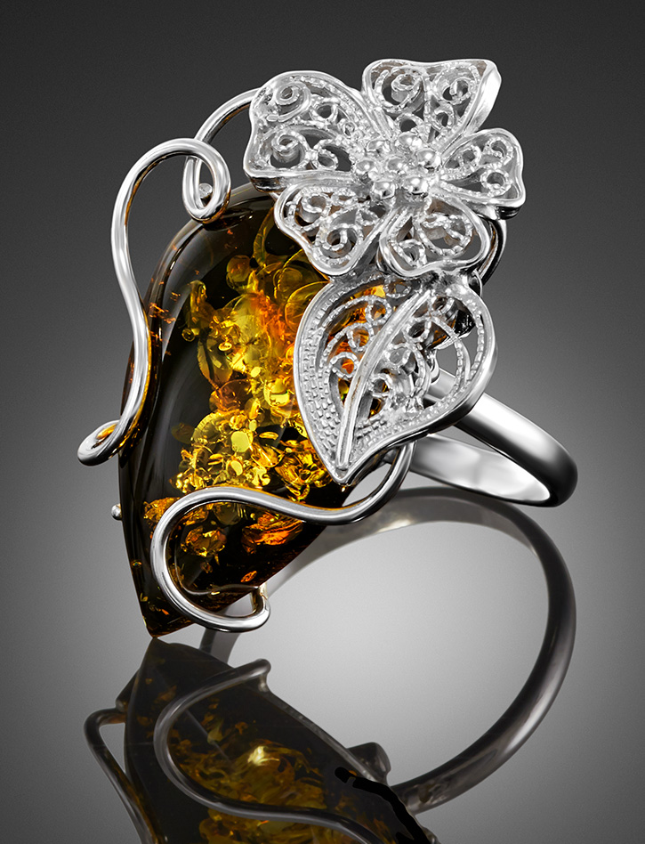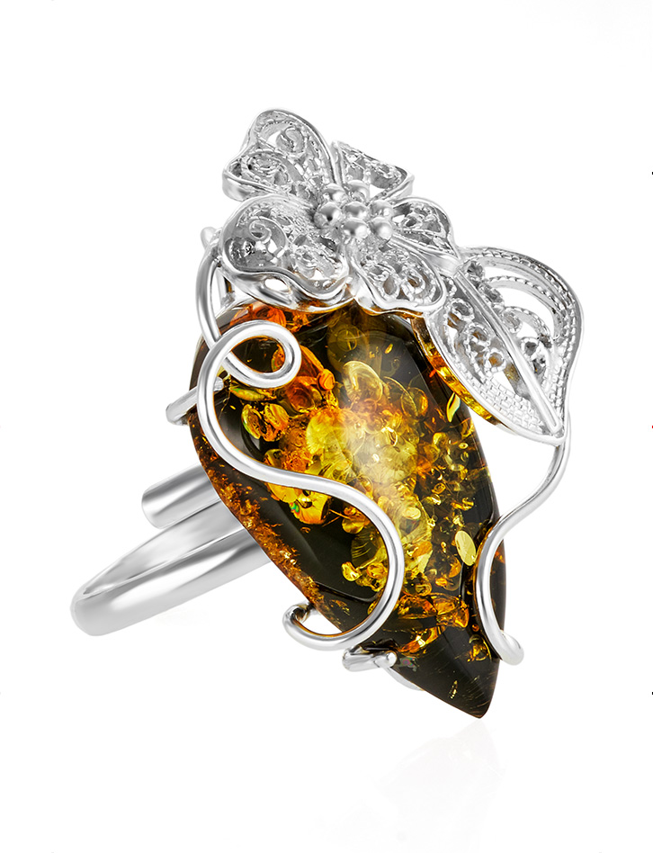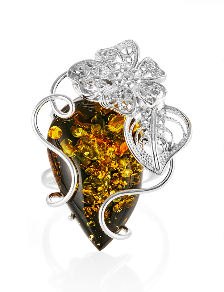 Изящное кольцо с натуральным янтарем красивого зелёного цвета «Филигрань»