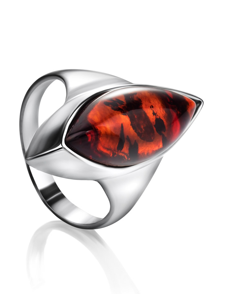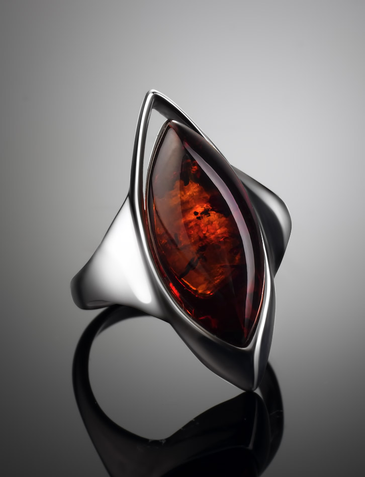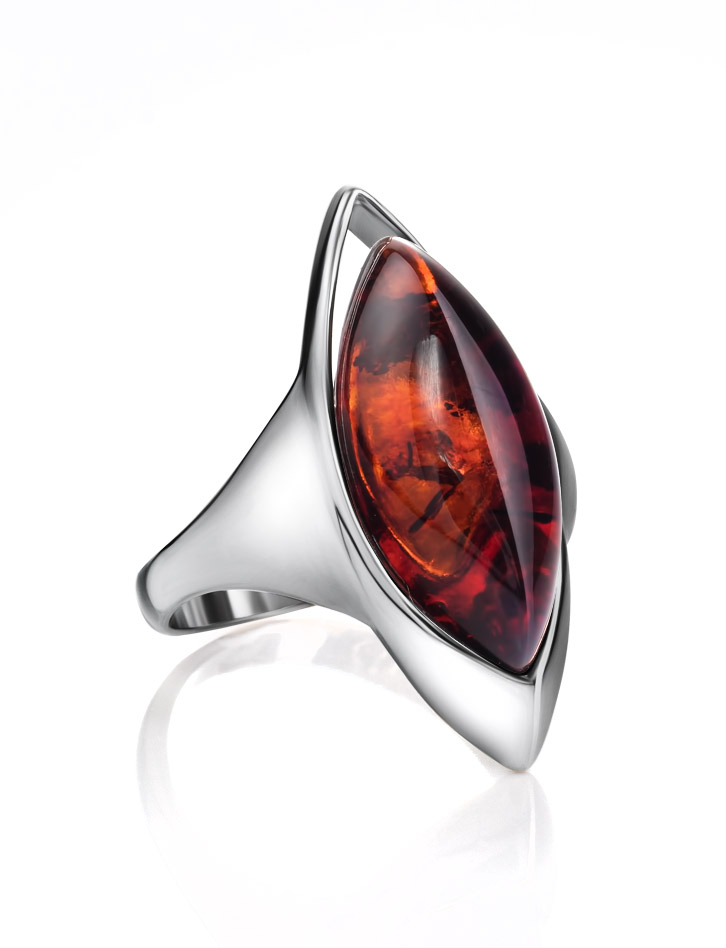 Изящное кольцо с ромбовидной вставкой натурального янтаря вишнёвого цвета «Акация»