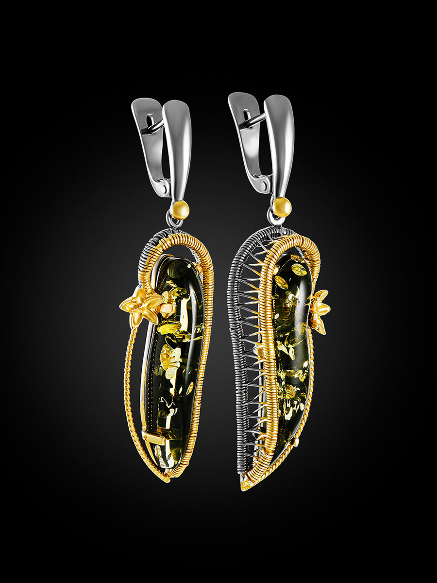 Изящные нарядные серьги с натуральным зелёным искрящимся янтарем «Филигрань»