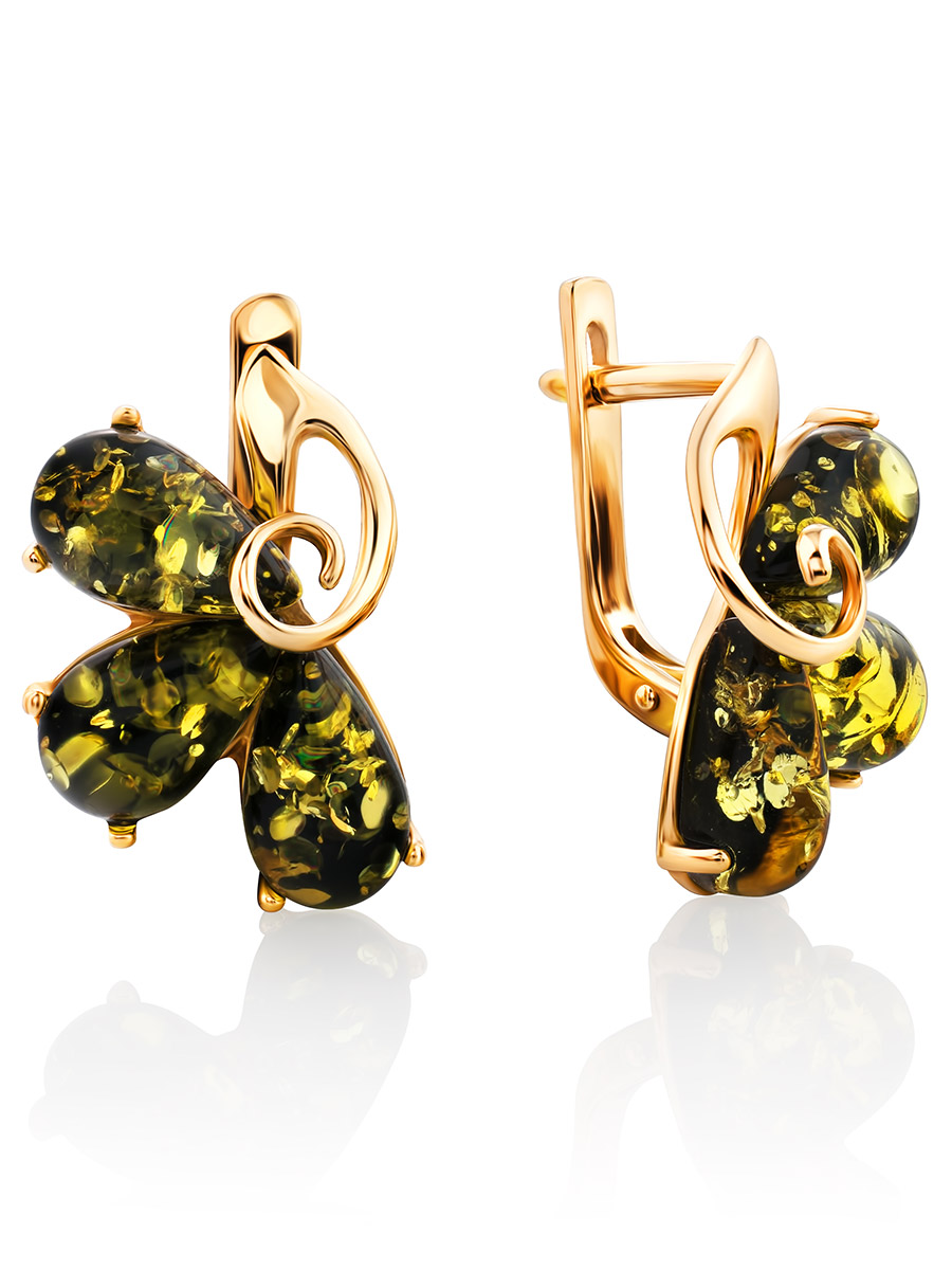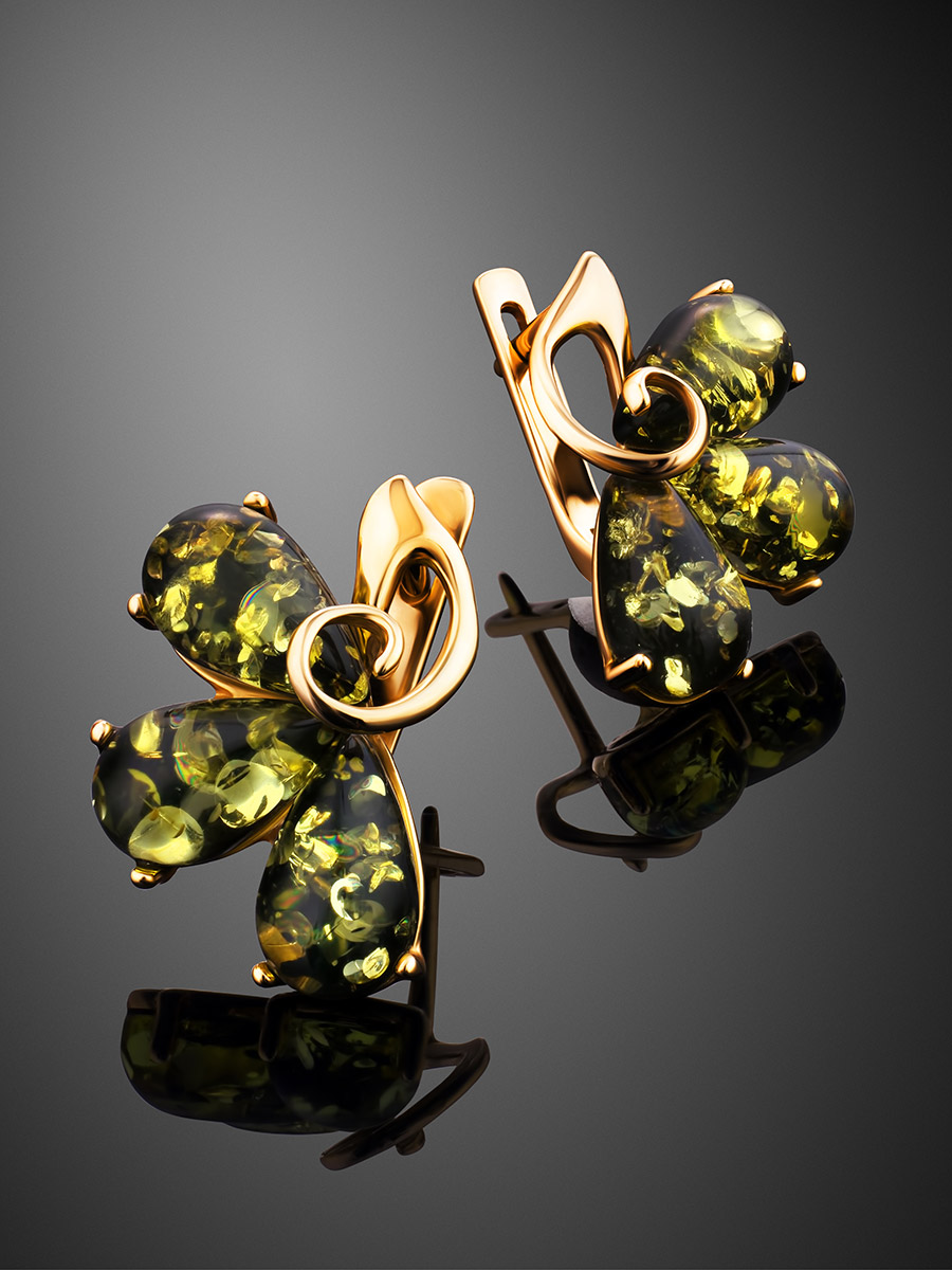 Изящные позолоченные серьги «Сакура» с зелёным янтарём