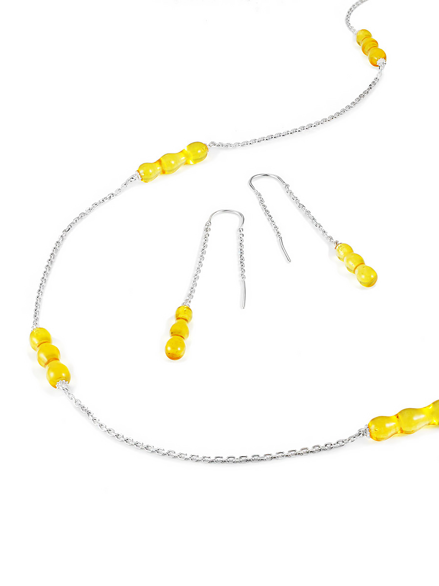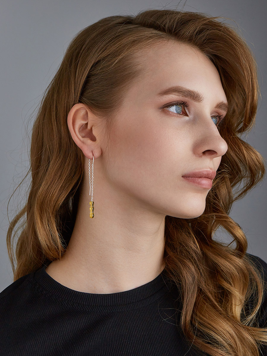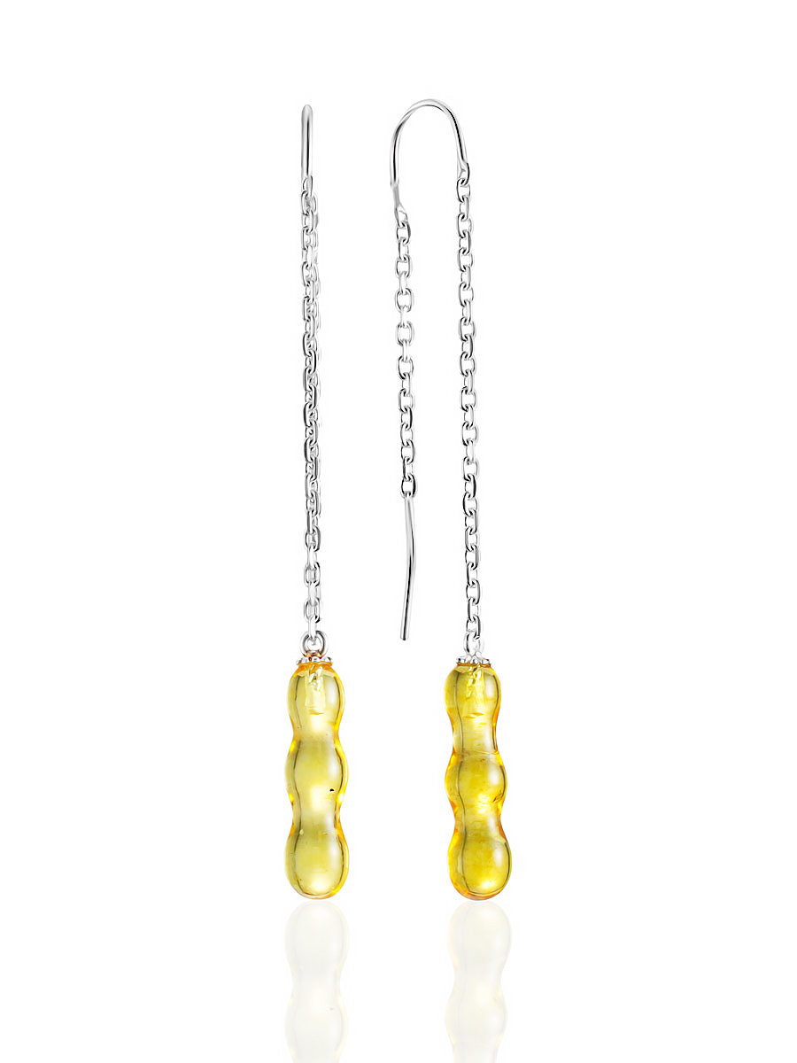 Изящные продевные серьги-цепочки с лимонным янтарём «Капель»