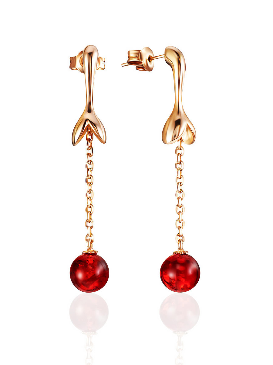 Изящные серьги-гвоздики «Орхидея» с ярко-алым янтарём