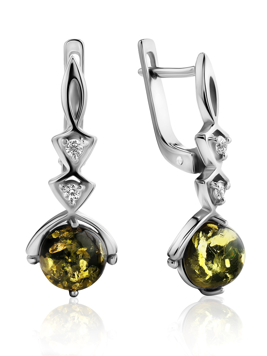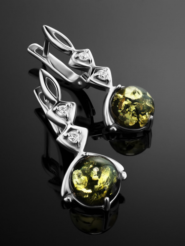 Изящные серьги с янтарём зелёного цвета и кристаллами «Самбия»