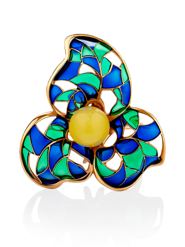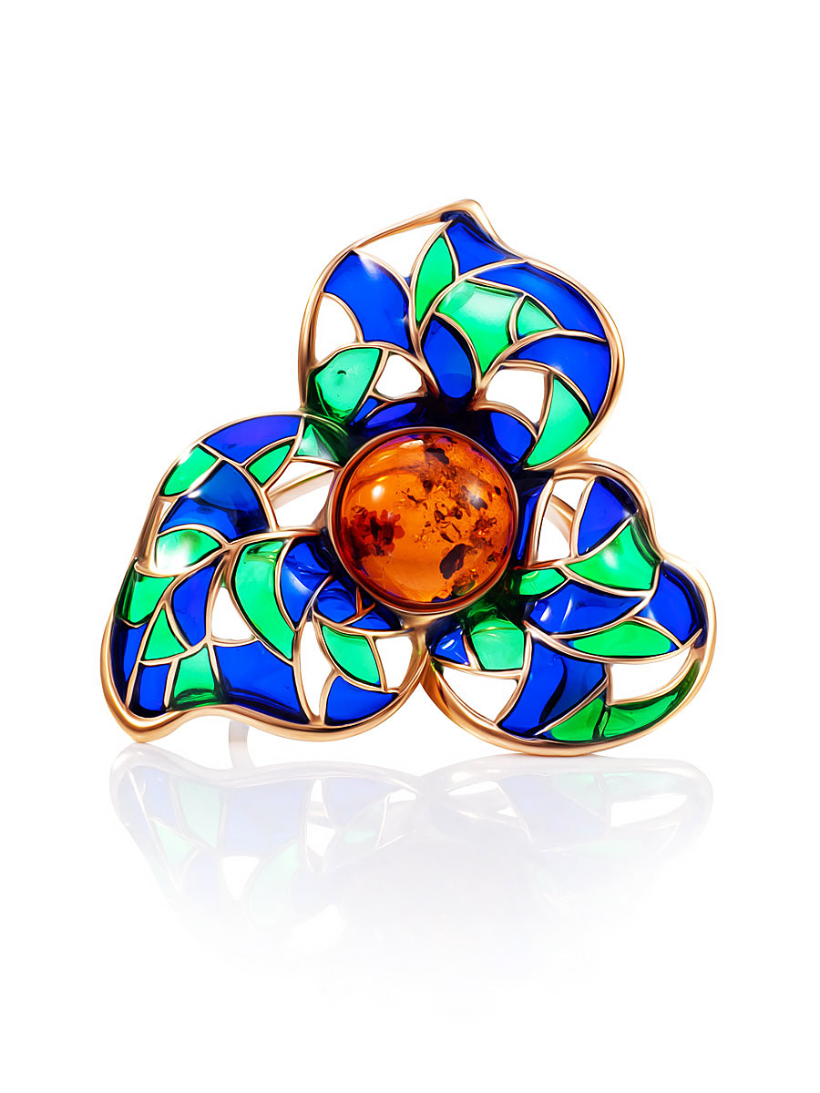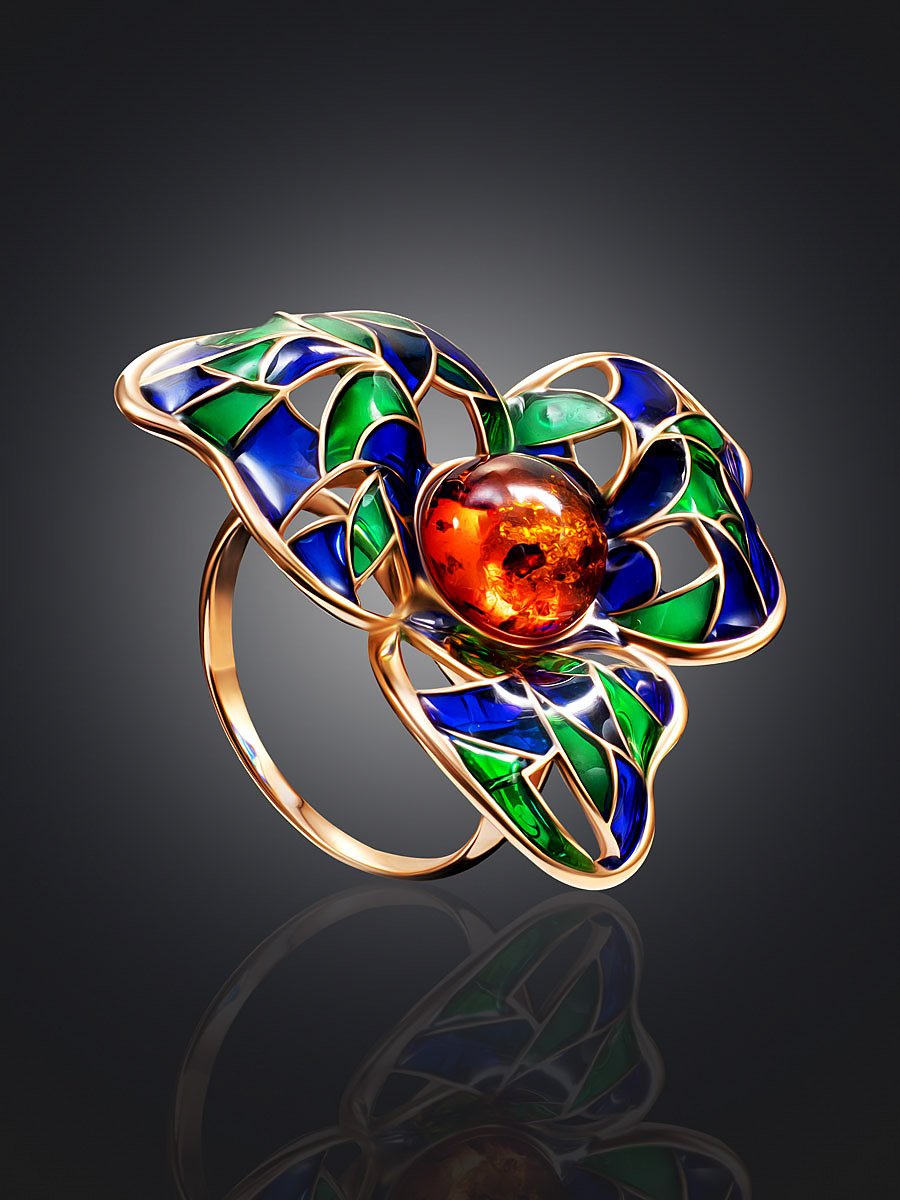 Изысканное ажурное кольцо Verona с натуральным янтарём и эмалью