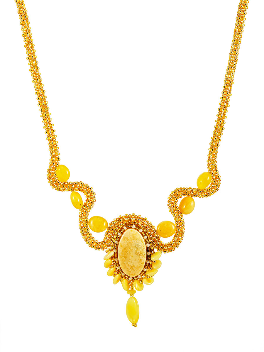 Изысканное колье из бисера и натурального балтийского янтаря «Лукоморье»