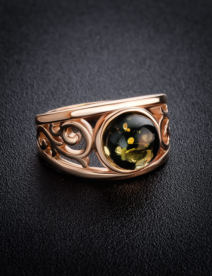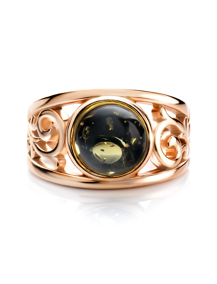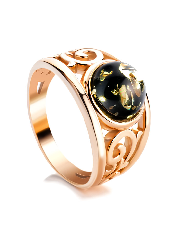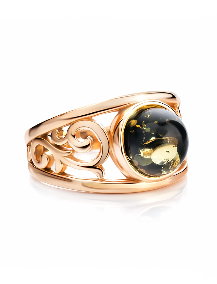 Изысканное золочённое кольцо с натуральным зелёным янтарём «Шахерезада»