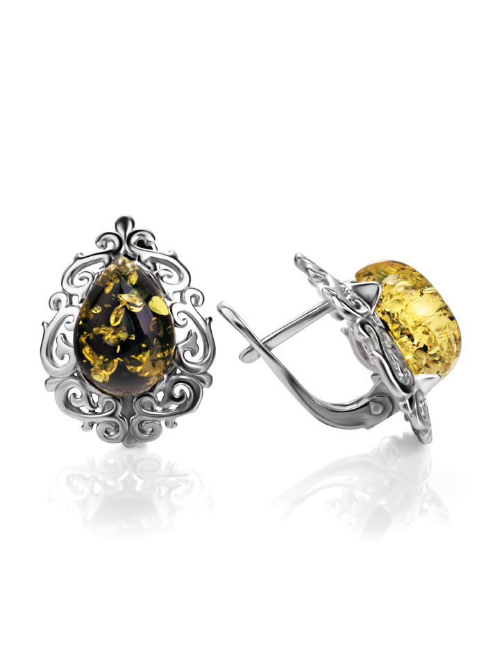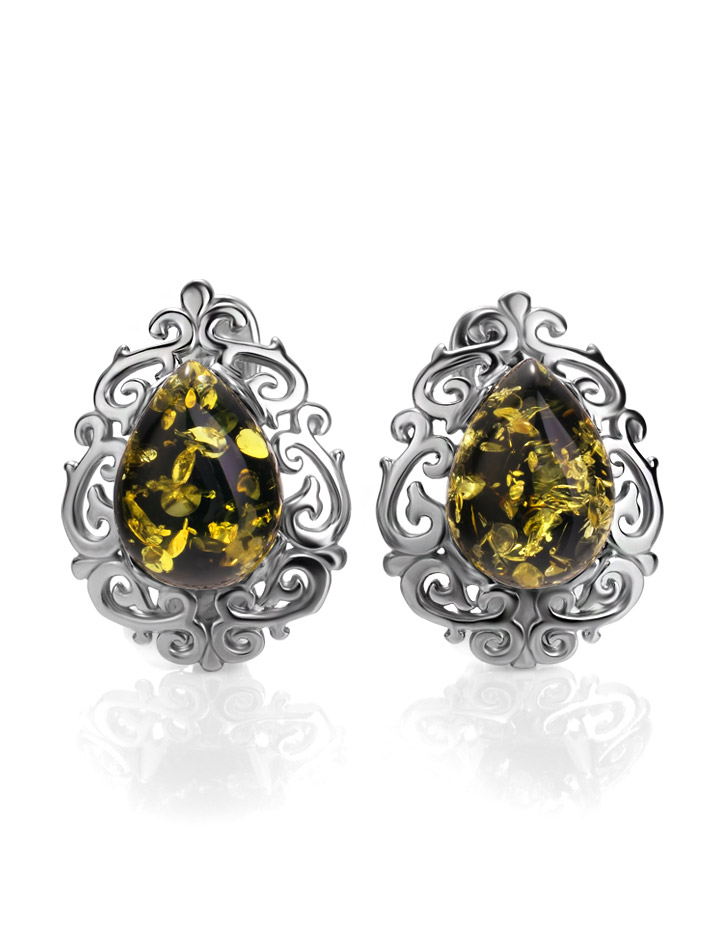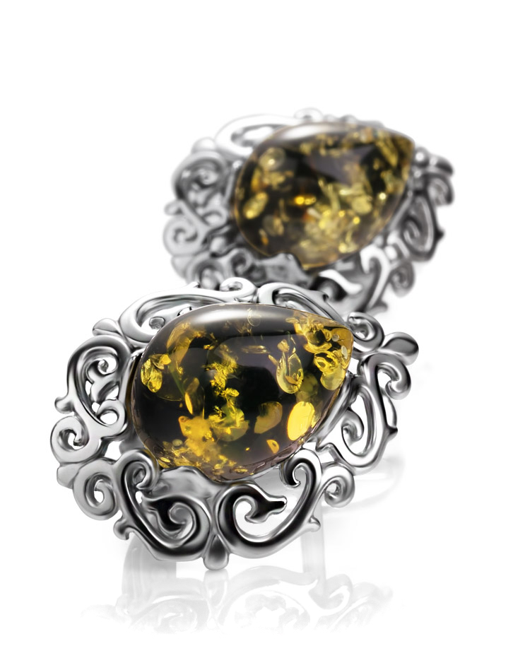 Изысканные ажурные серьги с натуральным зелёным янтарём «Луксор»