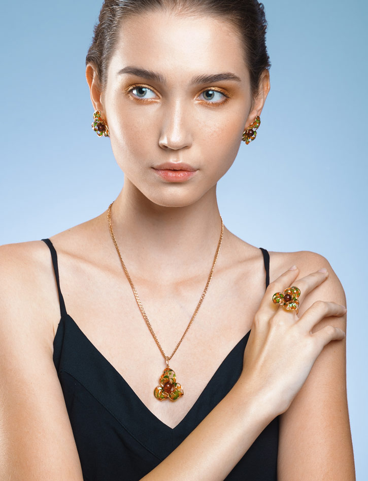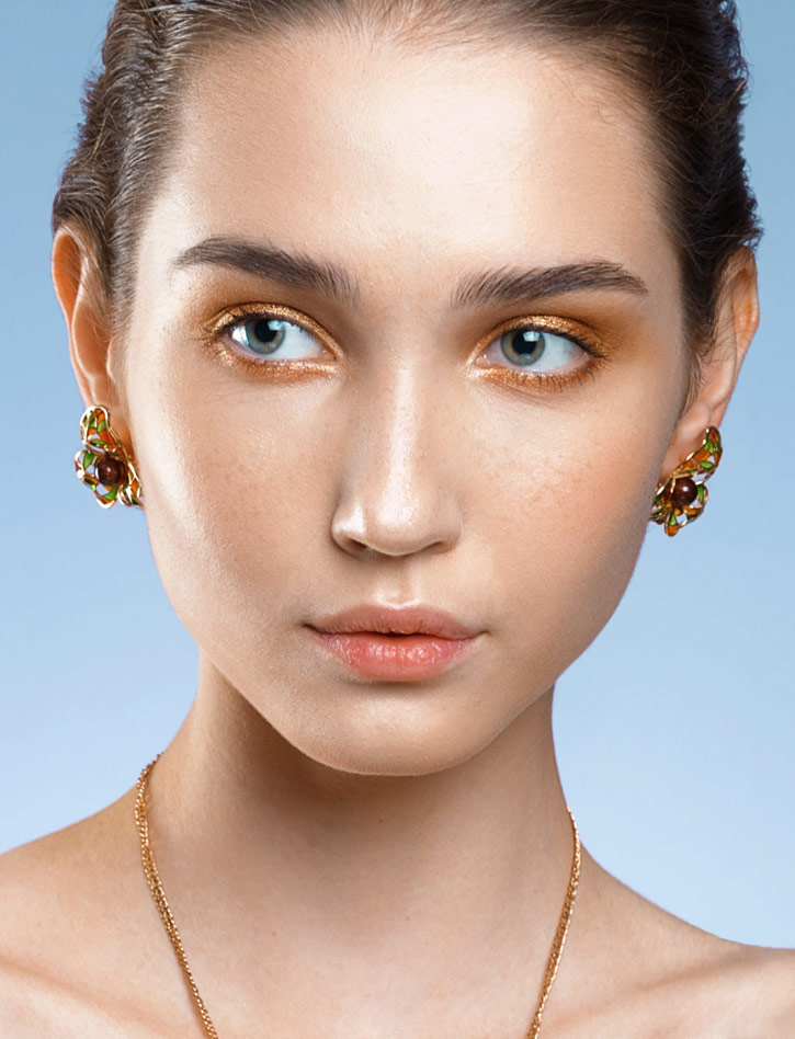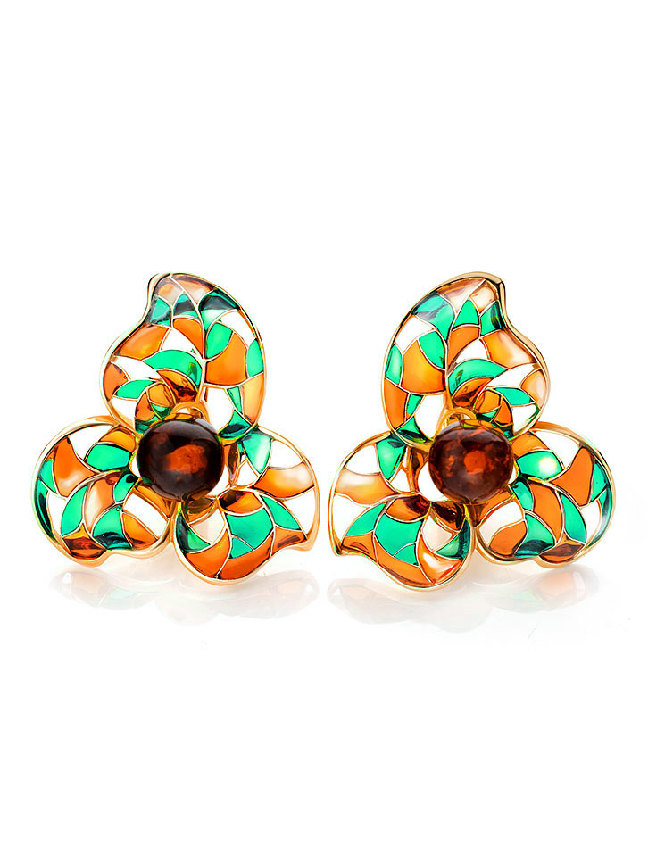 Изысканные позолоченные серьги с натуральным янтарём и эмалью Verona