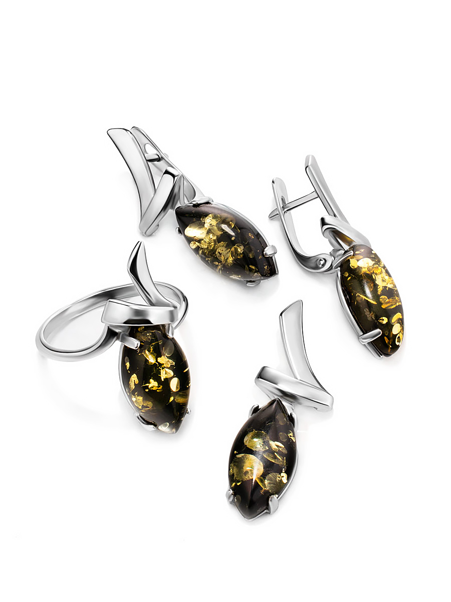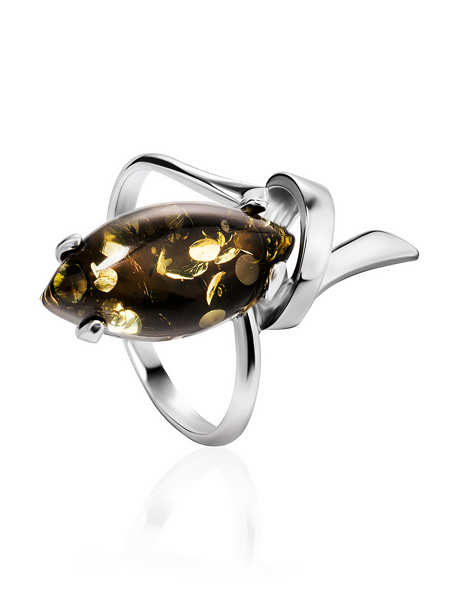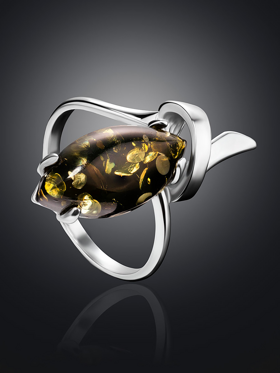 Кольцо «Ирис» из натурального янтаря зелёного цвета
