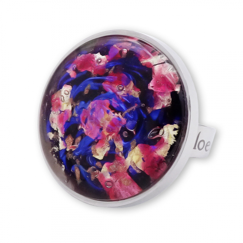Кольцо изготовлено из муранского стекла и гипоаллергенной ювелирной стали, что очень важно для людей с чувствительной кожей. Металл не темнеет и не подвергается воздействиям окружающей среды, надолго обеспечивая красивый внешний вид изделия. Диаметр стеклянного элемента - 2,5 см. Кольцо безразмерное, регулируется с 16 до 19 размера. Вес - 12 гр.