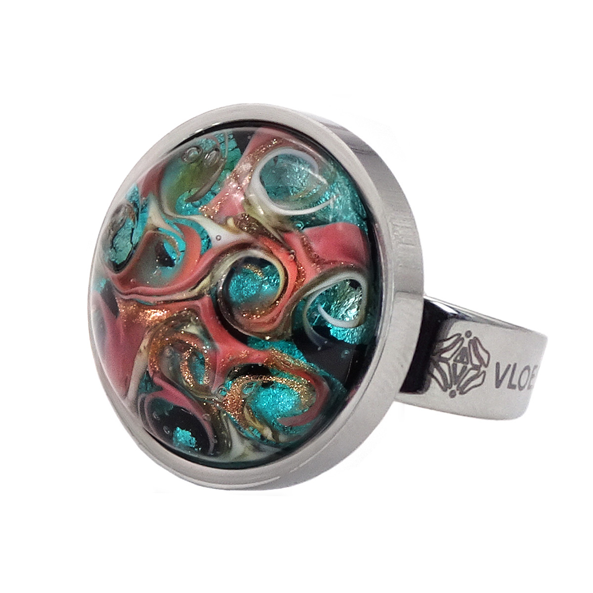 Кольцо изготовлено из муранского стекла и гипоаллергенной ювелирной стали, что очень важно для людей с чувствительной кожей. Металл не темнеет и не подвергается воздействиям окружающей среды, надолго обеспечивая красивый внешний вид изделия. Диаметр стеклянного элемента - 2 см. Кольцо безразмерное, регулируется с 16 до 19 размера. Вес - 8 гр.