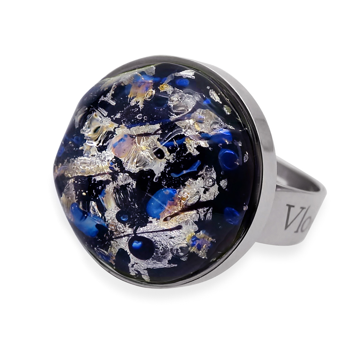 Кольцо изготовлено из муранского стекла и гипоаллергенной ювелирной стали, что очень важно для людей с чувствительной кожей. Металл не темнеет и не подвергается воздействиям окружающей среды, надолго обеспечивая красивый внешний вид изделия. Диаметр стеклянного элемента - 2 см. Кольцо безразмерное, регулируется с 16 до 19 размера. Вес - 8 гр.