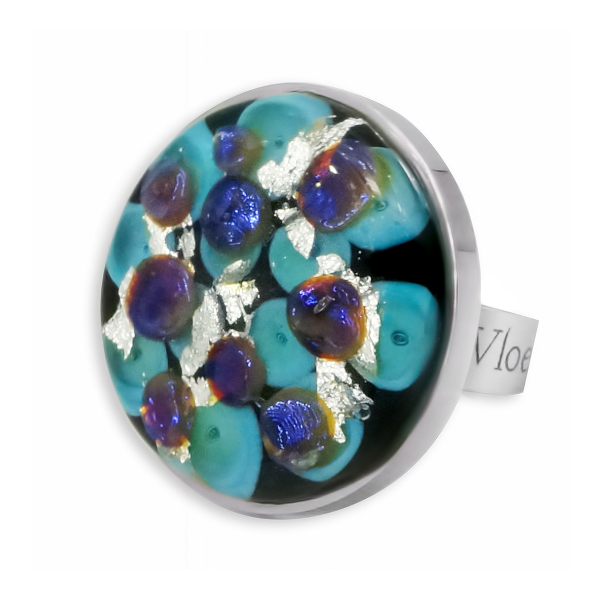 Кольцо изготовлено из муранского стекла и гипоаллергенной ювелирной стали, что очень важно для людей с чувствительной кожей. Металл не темнеет и не подвергается воздействиям окружающей среды, надолго обеспечивая красивый внешний вид изделия. Диаметр стеклянного элемента - 2,5 см. Кольцо безразмерное, регулируется с 16 до 19 размера. Вес - 12 гр.