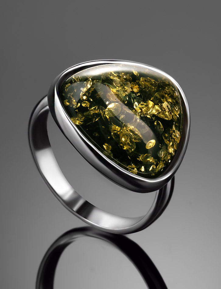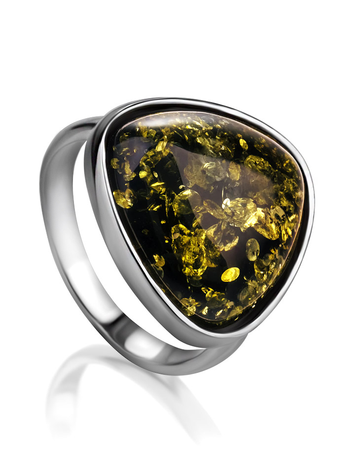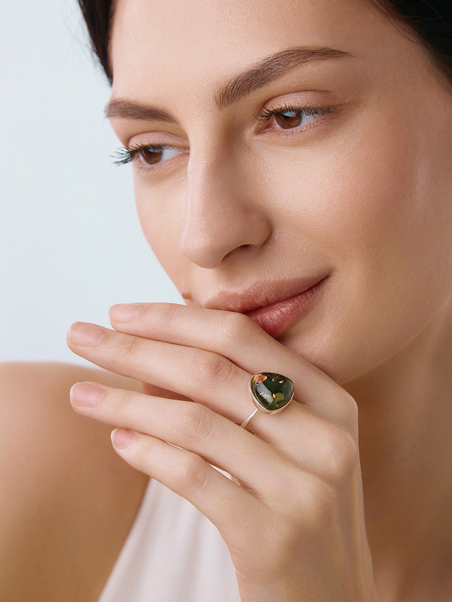 Кольцо с натуральным искрящимся янтарём зелёного цвета «Дельта»