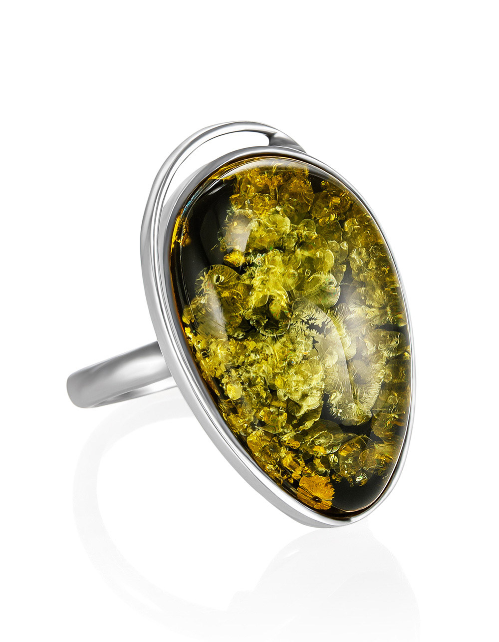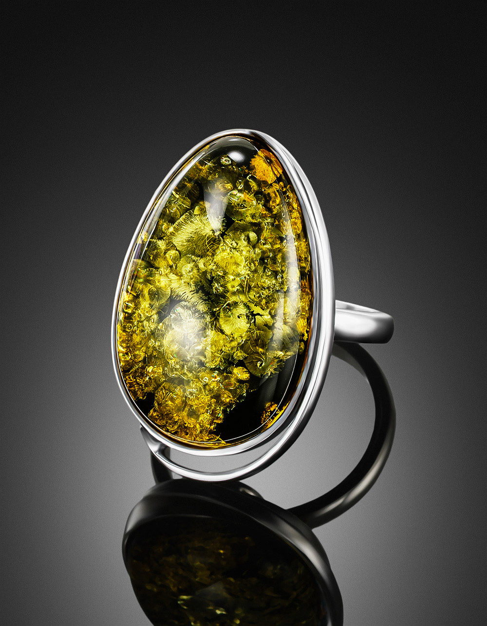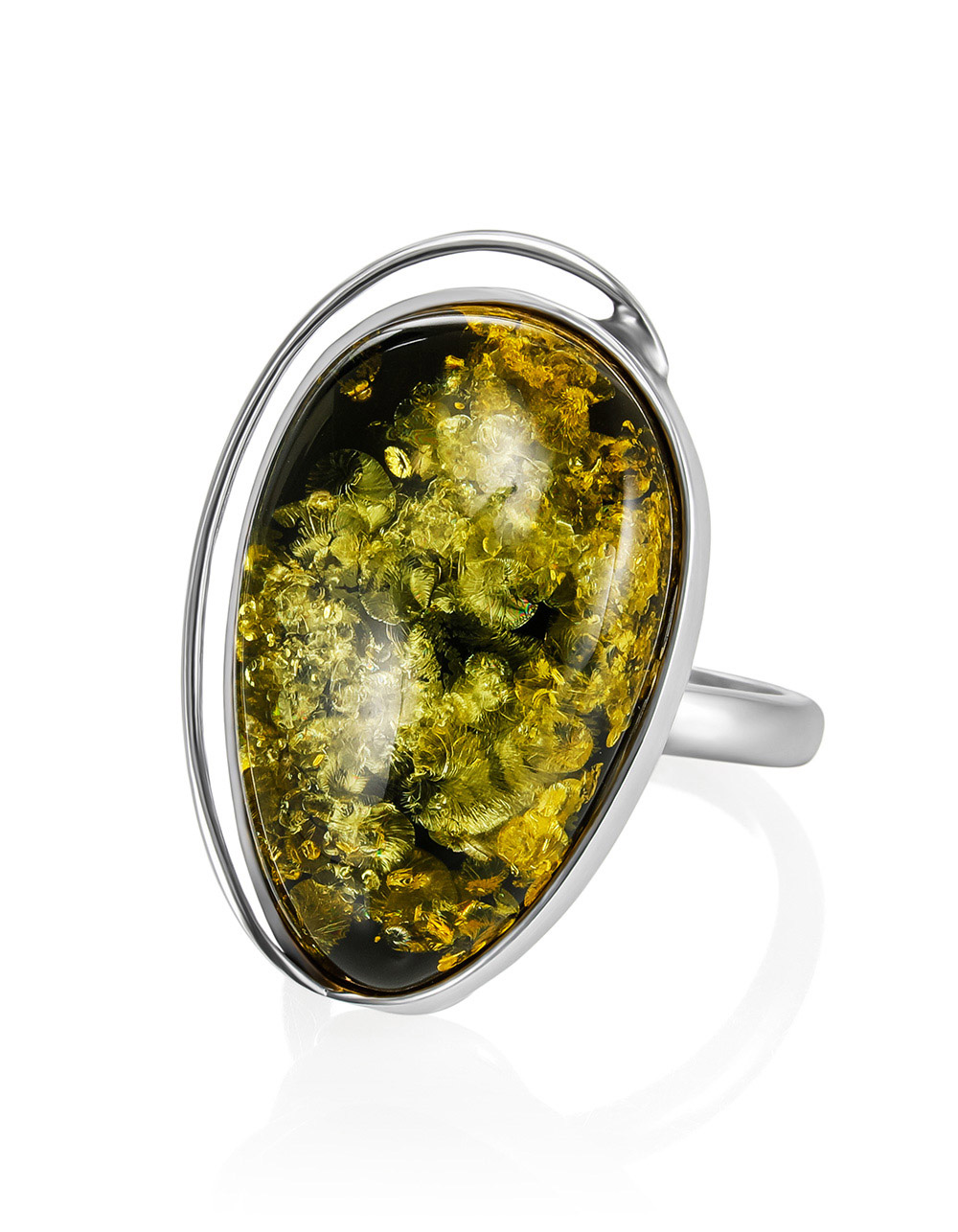 Кольцо с натуральным сверкающим янтарем зеленого цвета «Лагуна»