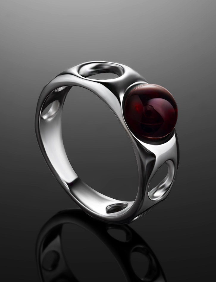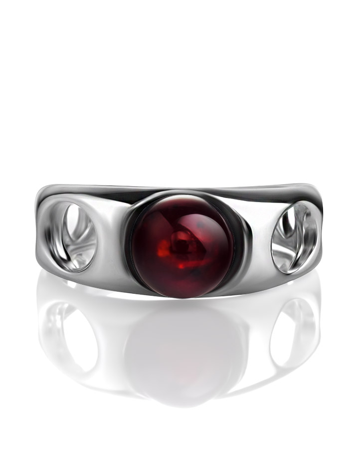Кольцо с вишнёвым янтарём в перфорированной оправе «Энигма»