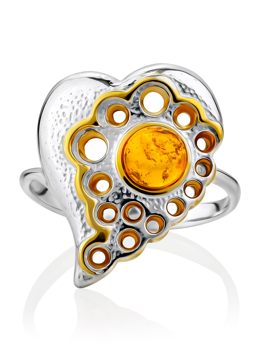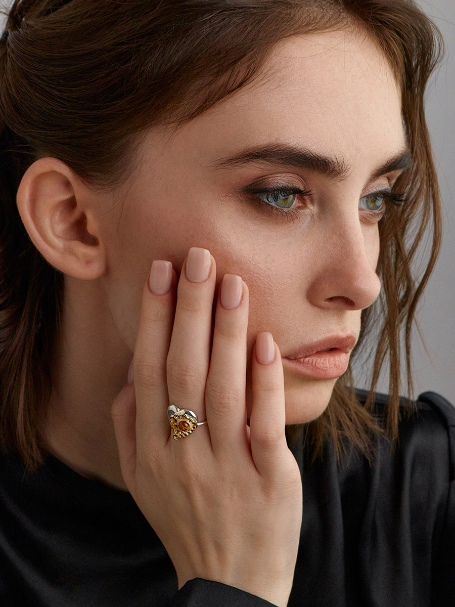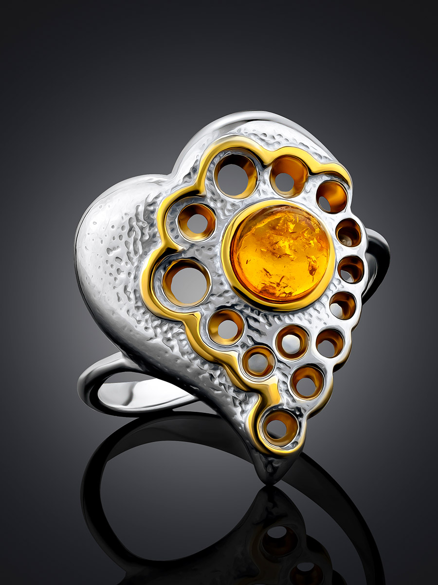 Кольцо «Сердце» в стиле стимпанк, украшенное янтарём