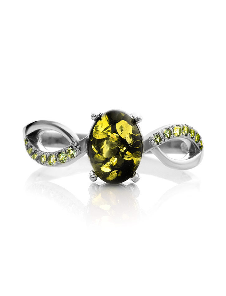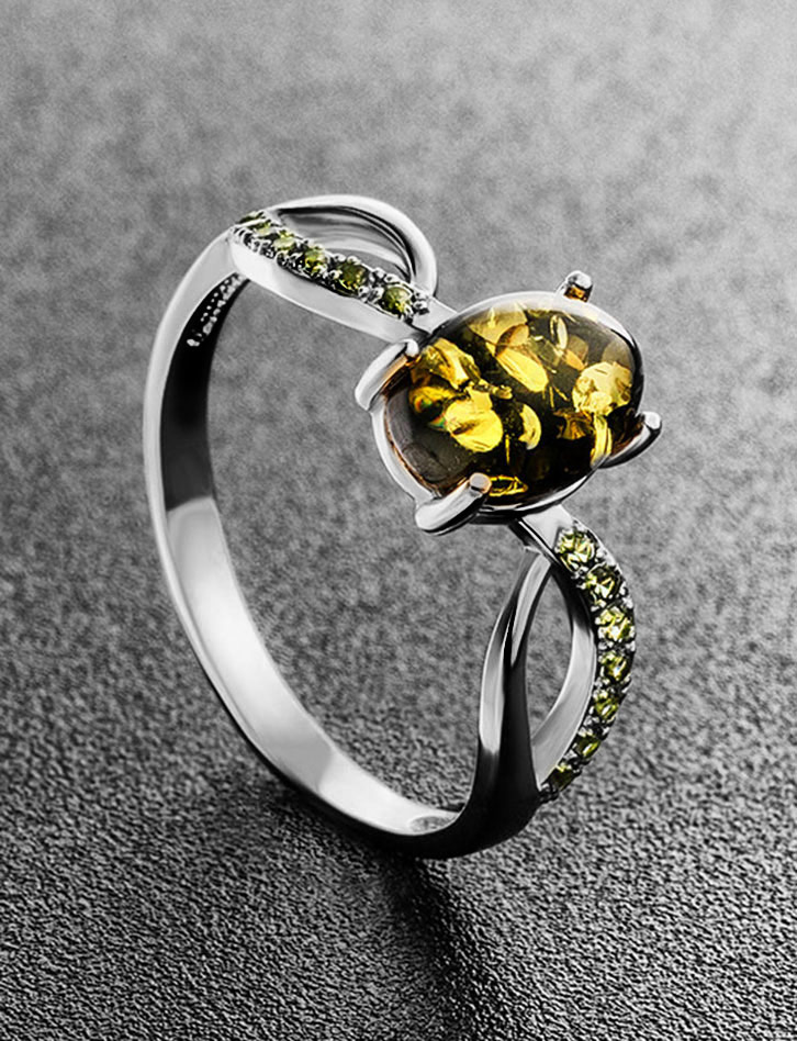 Кольцо, украшенное натуральным зелёным янтарём и фианитами «Ренессанс»