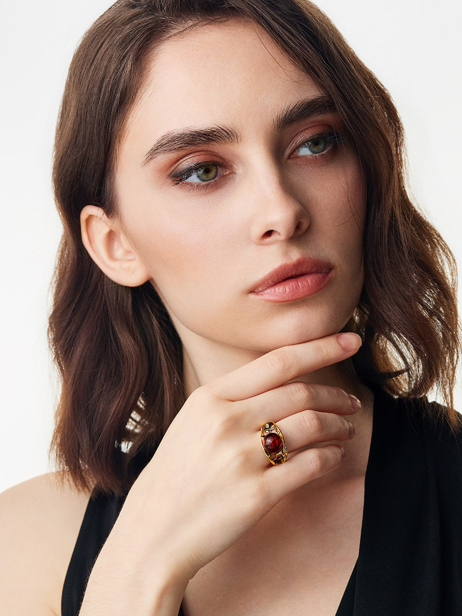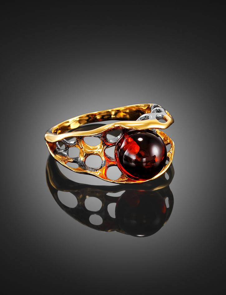 Кольцо в необычном дизайне, украшенное коньячным янтарём «Турандот»
