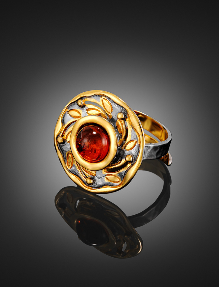 Кольцо в оригинальном дизайне с цельным коньячным янтарём «Аида»