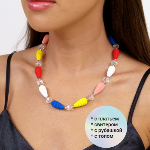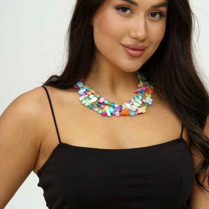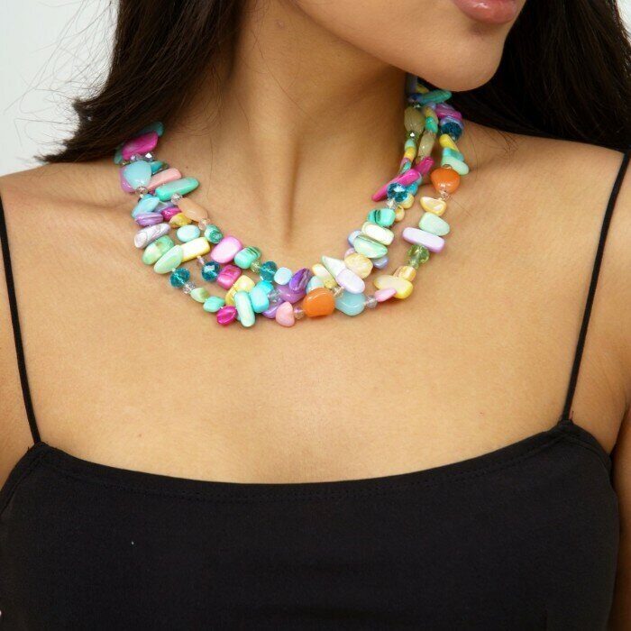 Описание Украшение из натуральных камней всегда пользуется большим успехом у прекрасного пола. Очаровательнве яркие разноцветное колье подчеркнет вашу индивидуальность. Отличный вариант в качестве подарка своим любимым. Состав: натуральные камни, металл. Размер: 51*4,5 см. Замок: кольцо. Вес: 151 гр.