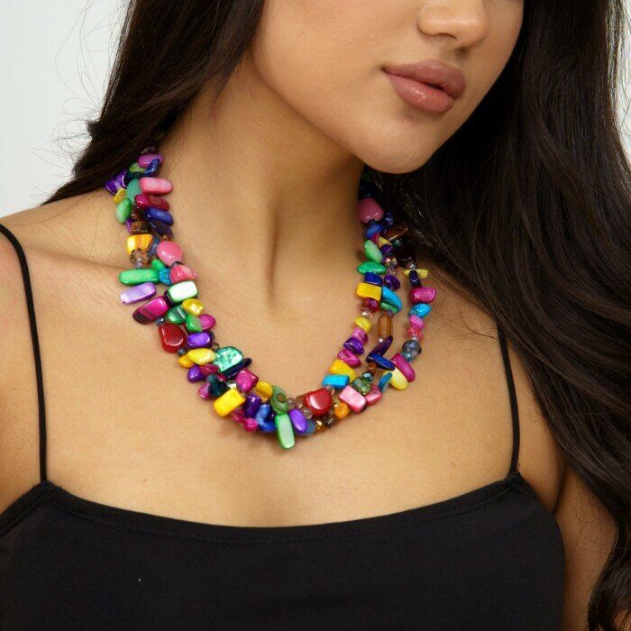 Описание Украшение из натуральных камней всегда пользуется большим успехом у прекрасного пола. Очаровательнве яркие разноцветное колье подчеркнет вашу индивидуальность. Отличный вариант в качестве подарка своим любимым. Состав: натуральные камни, металл. Размер: 51*4,5 см. Замок: кольцо. Вес: 151 гр.