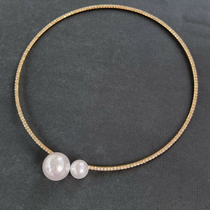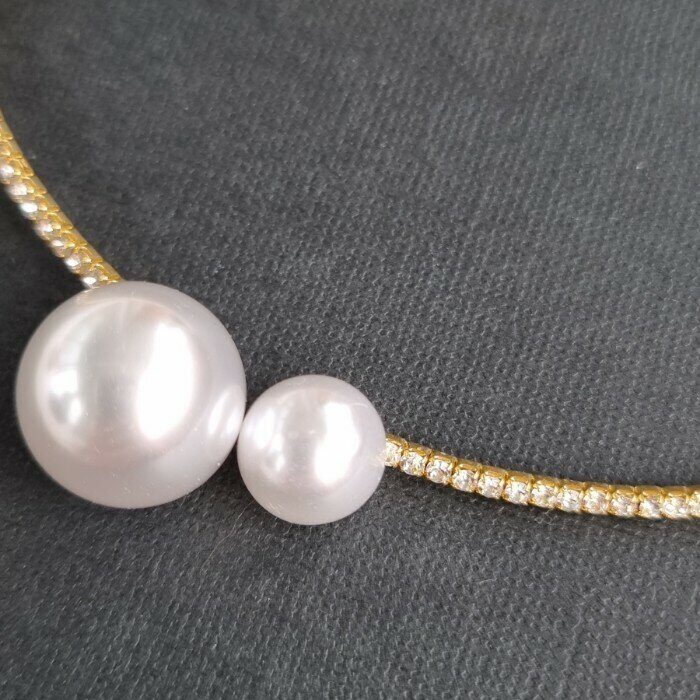 Описание Внутренний диаметр: 11,5 см. Ширина: 0,3 мм. Размер большой жемчужины: 1,5*1,5см. Размер маленькой жемчужины: 1*1 см. Вес: 12 гр.