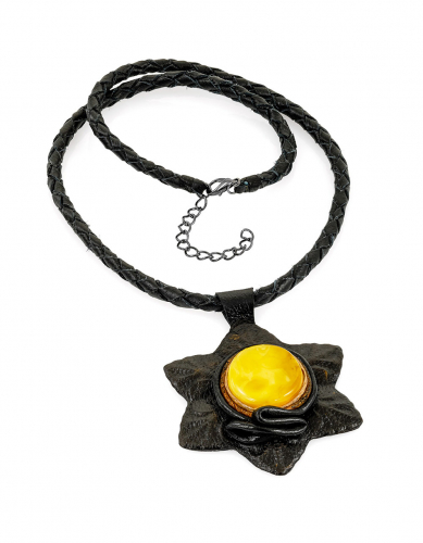 Колье-цветок из кожи «Амазонка» с медовым янтарём
