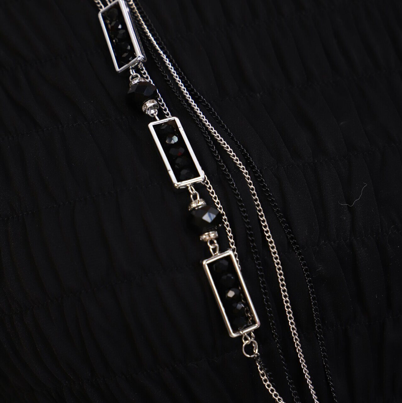 Описание Женское многослойное колье из цепочек. Длинное колье,украшенное камнями- это идеальный варинат как для повседневного образа,так и для праздничного. Длина: 87 (+6) см. Замок: карабин. Материал: металл, пластик. Вес: 58 гр.