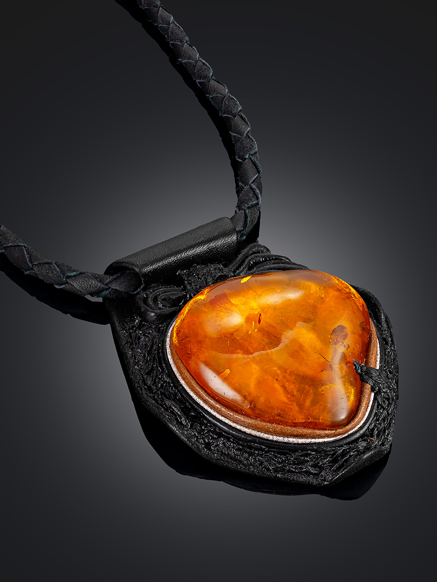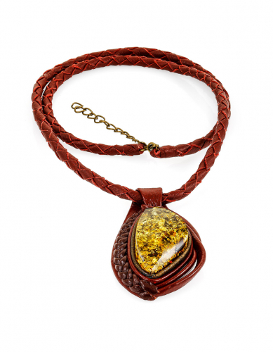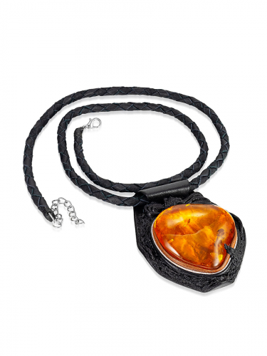 Колье из кожи «Амазонка» с крупным коньячным янтарём
