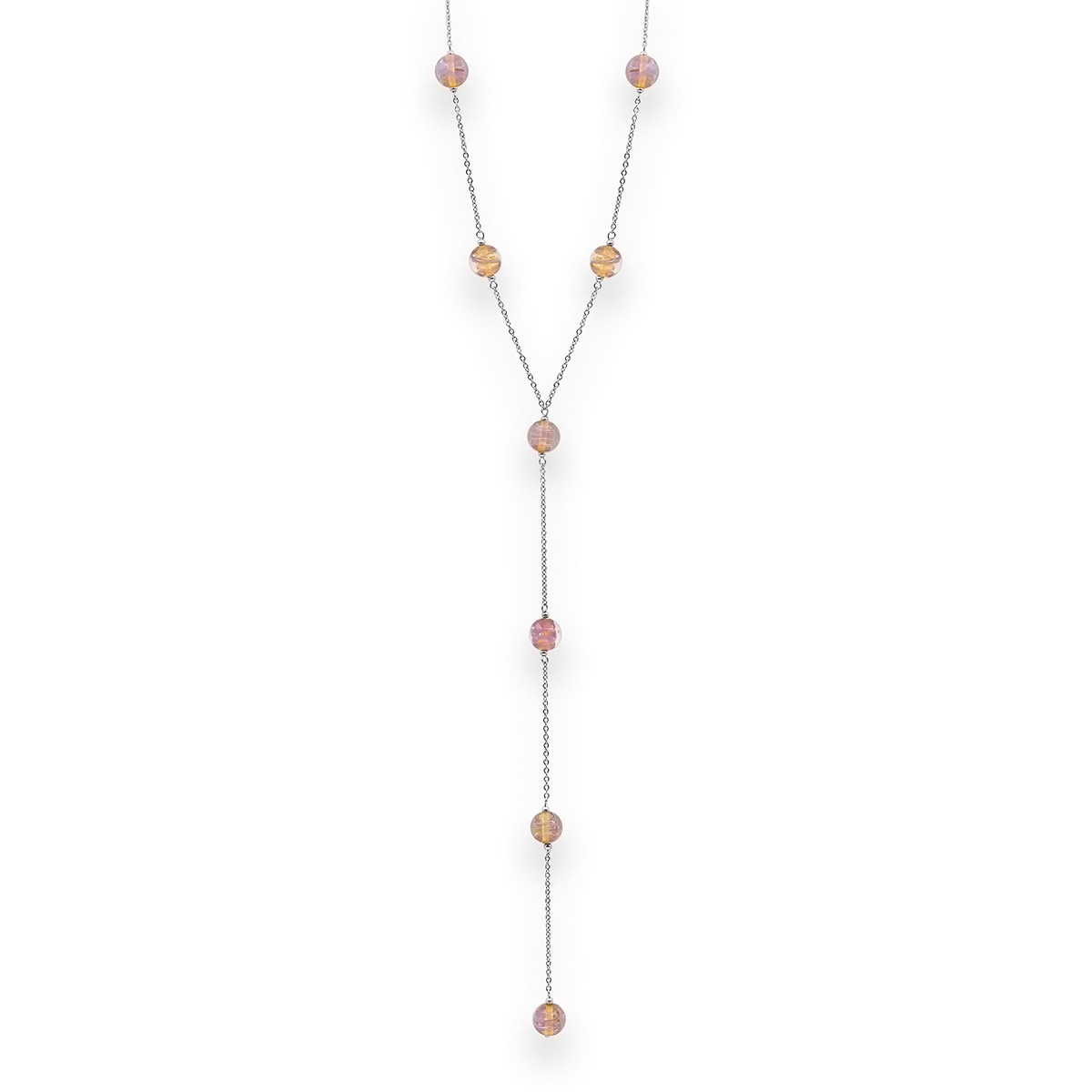 Колье изготовлено из натуральной кожи, муранского стекла и гипоаллергенной ювелирной стали, что очень важно для людей с чувствительной кожей. Металл не темнеет и не подвергается воздействиям окружающей среды, надолго обеспечивая красивый внешний вид изделия. Длина сотуара - 57 см + 5 см. удлиняющая цепочка. Длина "галстука"  24см. Диаметр стеклянного шарика - 1,2 см. Вес - 25 гр.