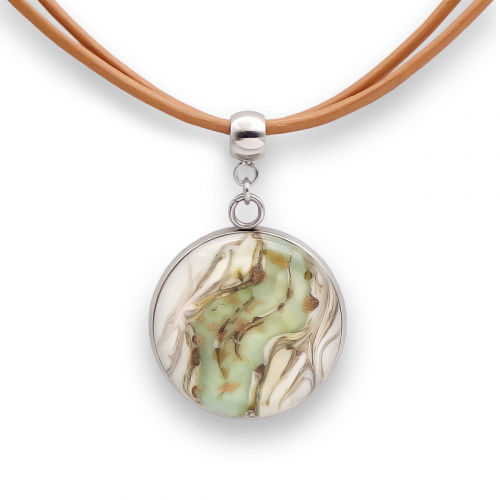 Колье изготовлено из натуральной кожи, муранского стекла и гипоаллергенной ювелирной стали, что очень важно для людей с чувствительной кожей. Металл не темнеет и не подвергается воздействиям окружающей среды, надолго обеспечивая красивый внешний вид изделия. Длина колье - 46 см + 5 см. удлиняющая цепочка. Диаметр стеклянного элемента - 2,5 см. Вес - 12 гр.