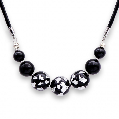 Колье изготовлено из натуральной кожи, муранского стекла и гипоаллергенной ювелирной стали, что очень важно для людей с чувствительной кожей. Металл не темнеет и не подвергается воздействиям окружающей среды, надолго обеспечивая красивый внешний вид изделия. Длина колье - 46 см + 5 см. удлиняющая цепочка. Диаметр бусин - 1, 1,2 и 1,5 см. Вес -  гр.