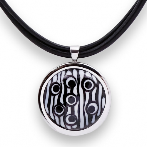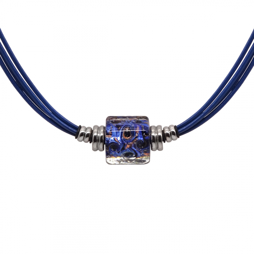 Колье изготовлено из натуральной кожи, муранского стекла и гипоаллергенной ювелирной стали, что очень важно для людей с чувствительной кожей. Металл не темнеет и не подвергается воздействиям окружающей среды, надолго обеспечивая красивый внешний вид изделия. Длина колье - 46 см + 5 см. удлиняющая цепочка. Диаметр стеклянного элемента - 2,5 см. Вес - 23 гр.