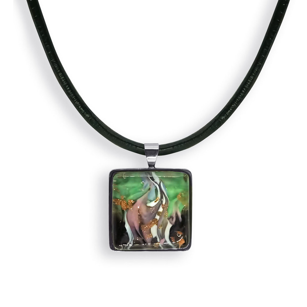 Колье изготовлено из натуральной кожи, муранского стекла и гипоаллергенной ювелирной стали, что очень важно для людей с чувствительной кожей. Металл не темнеет и не подвергается воздействиям окружающей среды, надолго обеспечивая красивый внешний вид изделия. Длина колье - 46 см + 5 см. удлиняющая цепочка. Размер стеклянного элемента - 2,2х2,2 см. Вес - 20 гр.
