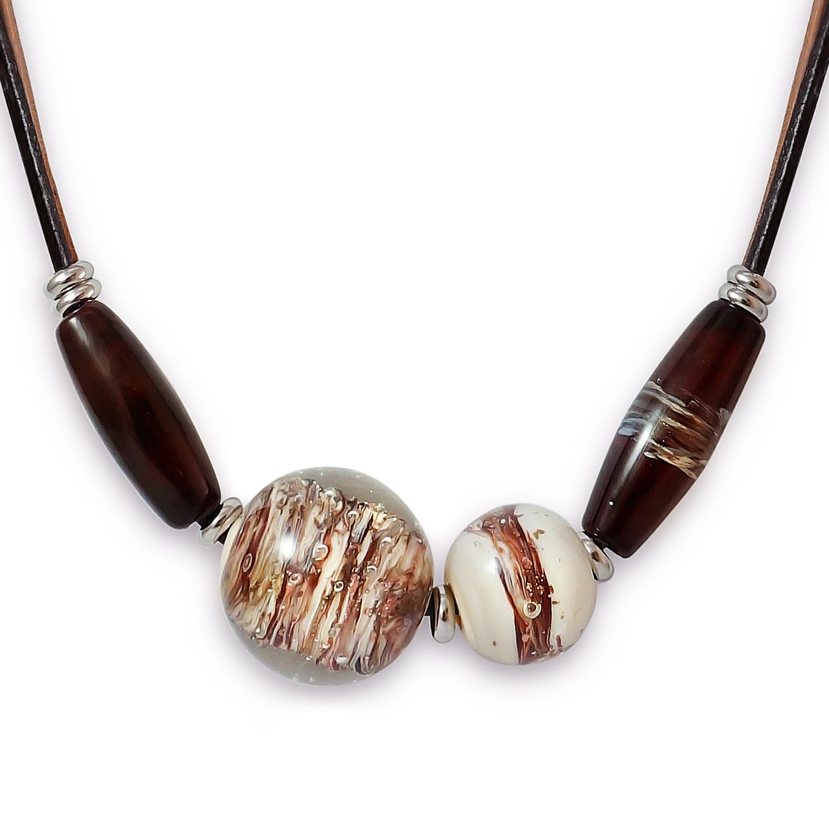 Колье изготовлено из натуральной кожи, муранского стекла и гипоаллергенной ювелирной стали, что очень важно для людей с чувствительной кожей. Металл не темнеет и не подвергается воздействиям окружающей среды, надолго обеспечивая красивый внешний вид изделия. Длина колье - 46 см + 5 см. удлиняющая цепочка. Размер стеклянных бусин - 3 и 3,5 см, диаметр шаров 2,2 и 2,5 см. Вес - 52 гр.