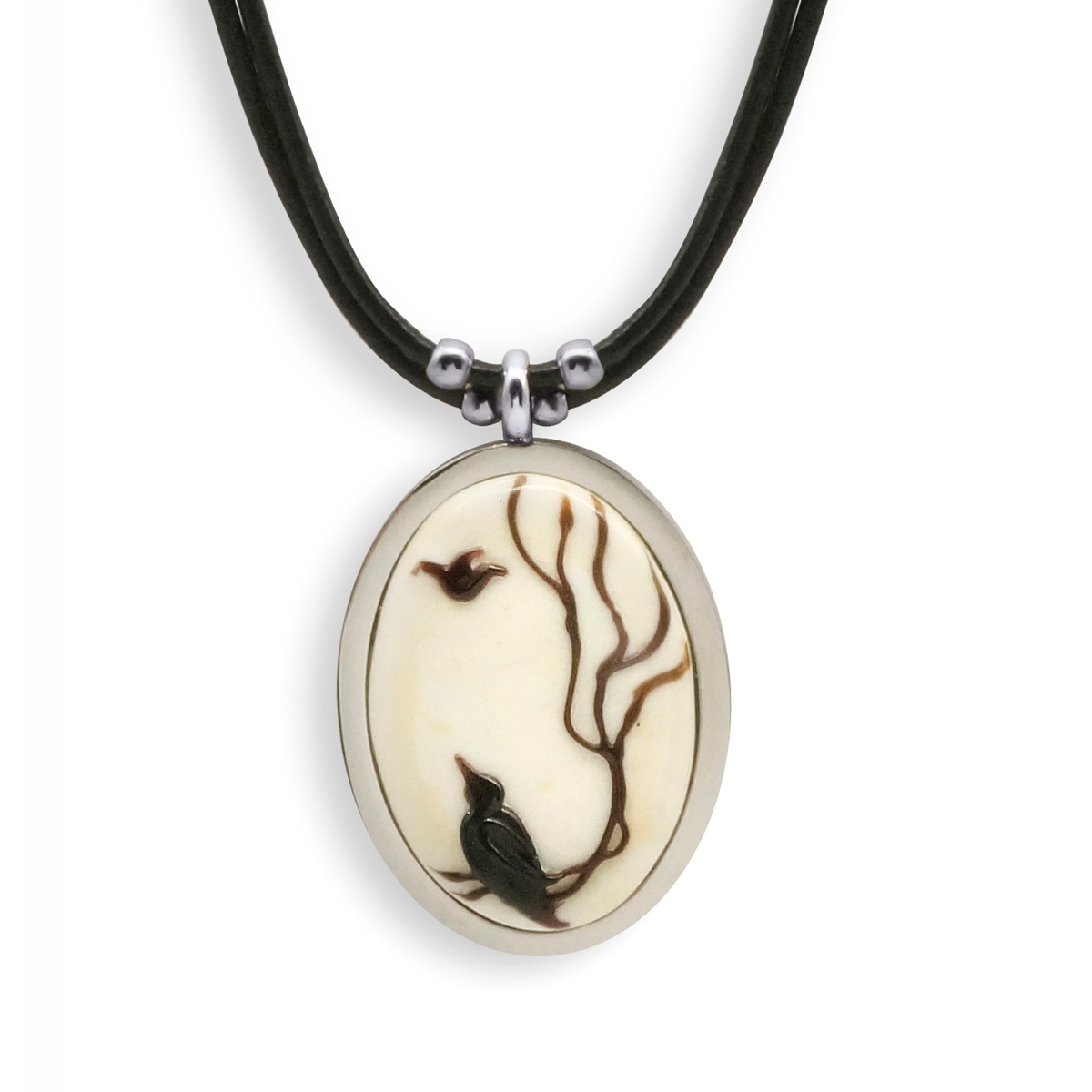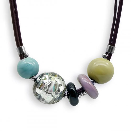 Колье изготовлено из натуральной кожи, муранского стекла и гипоаллергенной ювелирной стали, что очень важно для людей с чувствительной кожей. Металл не темнеет и не подвергается воздействиям окружающей среды, надолго обеспечивая красивый внешний вид изделия. Длина колье - 46 см + 5 см. удлиняющая цепочка. Размер стеклянного элемента - 4х3 см. Вес - 22  гр.