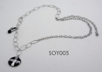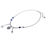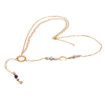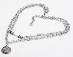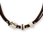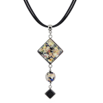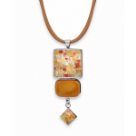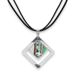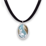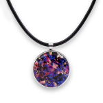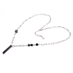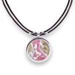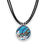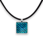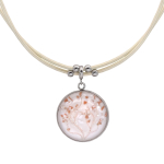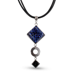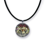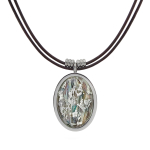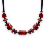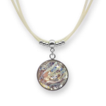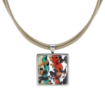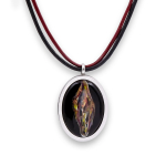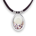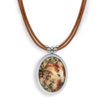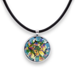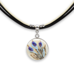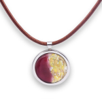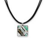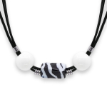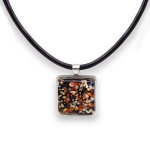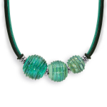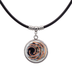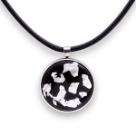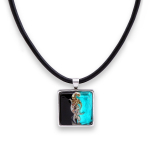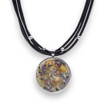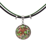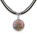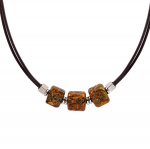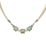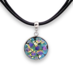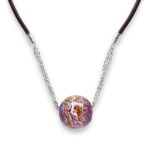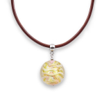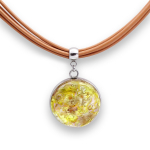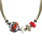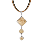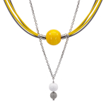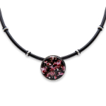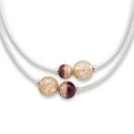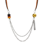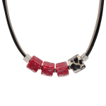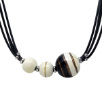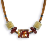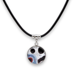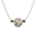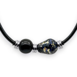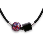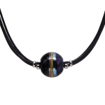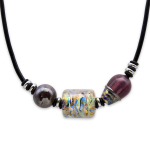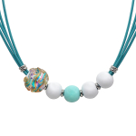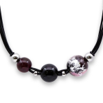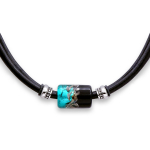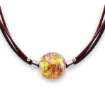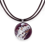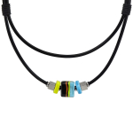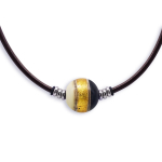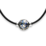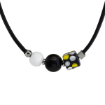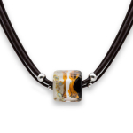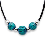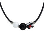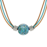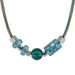 Колье изготовлено из натуральной кожи, муранского стекла и гипоаллергенной ювелирной стали, что очень важно для людей с чувствительной кожей. Металл не темнеет и не подвергается воздействиям окружающей среды, надолго обеспечивая красивый внешний вид изделия. Длина колье - 46 см + 5 см. удлиняющая цепочка. Диаметр стеклянных элементов - 2,5 и 20 см. Вес - 22 гр.