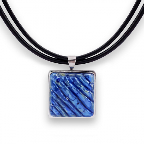 Колье изготовлено из натуральной кожи, муранского стекла и гипоаллергенной ювелирной стали, что очень важно для людей с чувствительной кожей. Металл не темнеет и не подвергается воздействиям окружающей среды, надолго обеспечивая красивый внешний вид изделия. Длина колье - 46 см + 5 см. удлиняющая цепочка. Диаметр стеклянного элемента - 2,5 см. Вес - 19 гр.