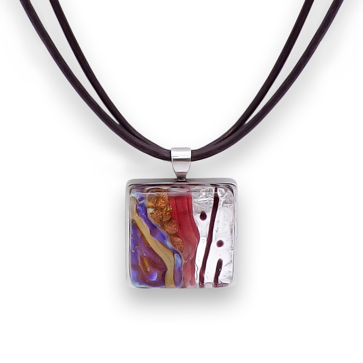Колье изготовлено из натуральной кожи, муранского стекла и гипоаллергенной ювелирной стали, что очень важно для людей с чувствительной кожей. Металл не темнеет и не подвергается воздействиям окружающей среды, надолго обеспечивая красивый внешний вид изделия. Длина колье - 46 см + 5 см. удлиняющая цепочка. Размер стеклянного элемента - 2,2 см. Вес - 20 гр.