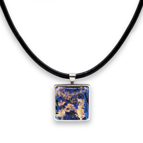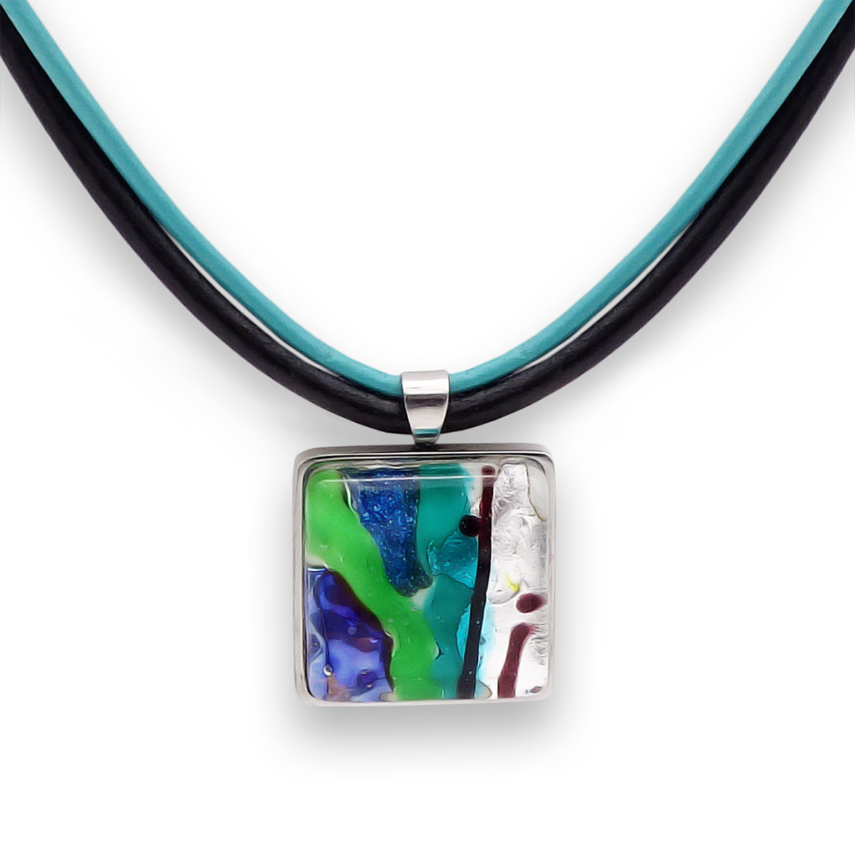 Колье изготовлено из натуральной кожи, муранского стекла и гипоаллергенной ювелирной стали, что очень важно для людей с чувствительной кожей. Металл не темнеет и не подвергается воздействиям окружающей среды, надолго обеспечивая красивый внешний вид изделия. Длина колье - 46 см + 5 см. удлиняющая цепочка. Размер стеклянного элемента - 2,2 см. Вес - 20 гр.