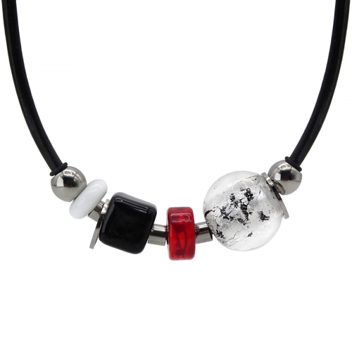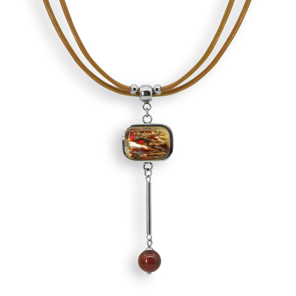 Колье изготовлено из натуральной кожи, муранского стекла и гипоаллергенной ювелирной стали, что очень важно для людей с чувствительной кожей. Металл не темнеет и не подвергается воздействиям окружающей среды, надолго обеспечивая красивый внешний вид изделия. Длина колье - 46 см + 5 см. удлиняющая цепочка. Длина кулона - 5 см. Размер стеклянного элемента - 2х1,5 см, шар - 1 см. Вес - 14 гр.