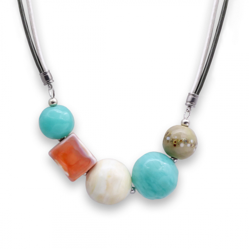 Колье изготовлено из натуральной кожи, муранского стекла и гипоаллергенной ювелирной стали, что очень важно для людей с чувствительной кожей. Металл не темнеет и не подвергается воздействиям окружающей среды, надолго обеспечивая красивый внешний вид изделия. Длина колье - 46 см + 5 см. удлиняющая цепочка. Диаметр стеклянного шара - 2,5 см. Вес - 30 гр.
