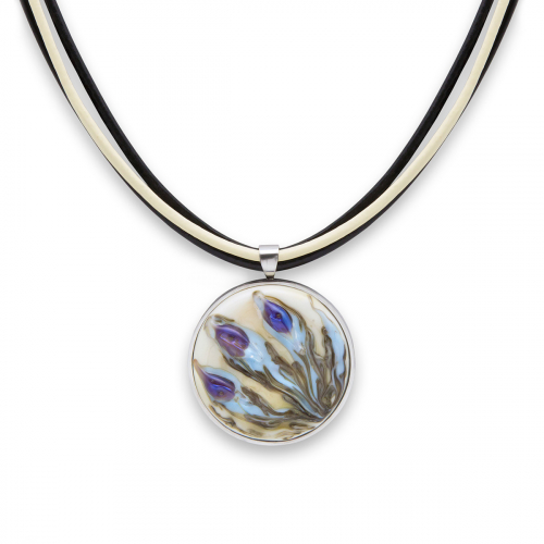 Колье изготовлено из натуральной кожи, муранского стекла и гипоаллергенной ювелирной стали, что очень важно для людей с чувствительной кожей. Металл не темнеет и не подвергается воздействиям окружающей среды, надолго обеспечивая красивый внешний вид изделия. Длина колье - 46 см + 5 см. удлиняющая цепочка. Диаметр стеклянных шаров - 1,5 и 2,2 см. Вес - 32 гр.