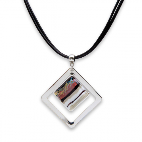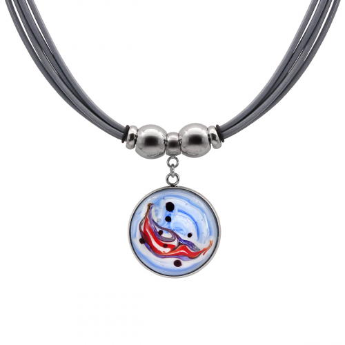 Колье изготовлено из натуральной кожи, муранского стекла и гипоаллергенной ювелирной стали, что очень важно для людей с чувствительной кожей. Металл не темнеет и не подвергается воздействиям окружающей среды, надолго обеспечивая красивый внешний вид изделия. Длина колье - 46 см + 5 см. удлиняющая цепочка. Длина кулона - 5 см. Размер стеклянного элемента - 3х3 см. Вес - 23 гр.